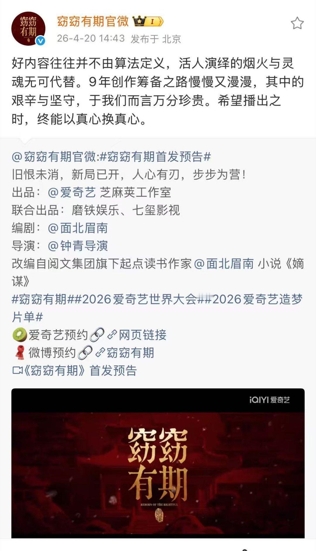 窈窈有期官微说活人演绎无可替代 窈窈有期官微好刚 敢在自家平台片单里内涵算法,这