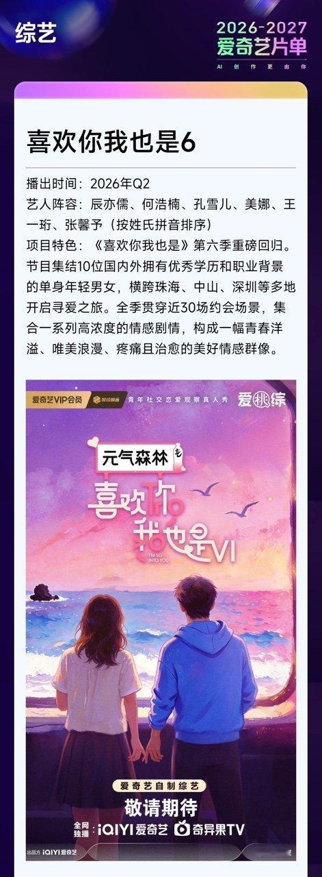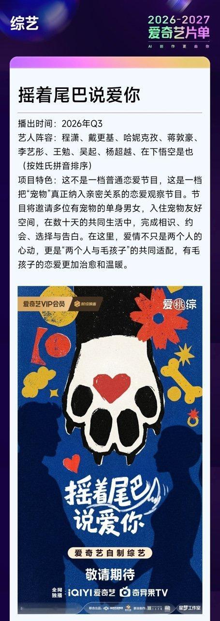 谁还说恋综没新意!爱奇艺2026恋综片单直接杀疯了,不搞套路,专搞贴近生活的真实感。《带着妈妈去相亲》亲情爱情双在线,《摇着尾巴说爱你》让毛孩子在线助攻,毛茸茸的甜蜜谁顶得住!这种接地气设定真的狠狠期待住了~爱奇艺恋综不按套路出牌爱奇艺恋综也太懂年轻人了