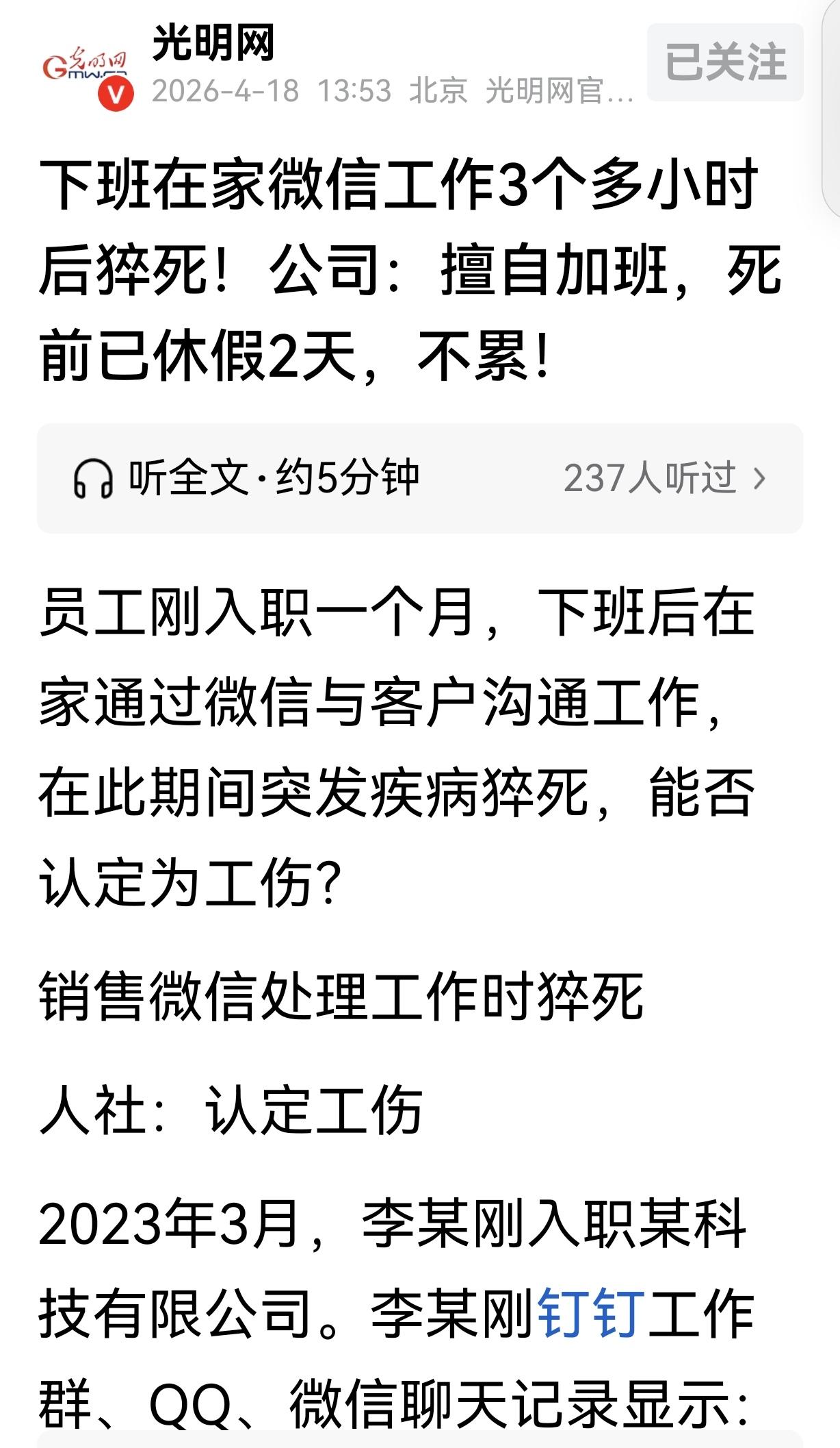 “周扒皮都甘拜下风!”河南郑州,一男子在某公司才上班1个月,一天,他下班后,微信回复工作信息,长达3小时,当晚,男子猝死,人社局认为男子属于工伤,竟被男子的公司告上法庭:没人让他加班,他是擅自加班的,他死前已休假2天,他不是累死的。法院判决让公司傻眼。