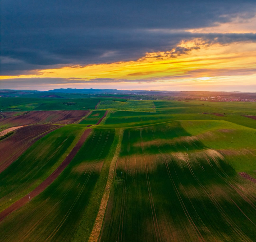 捷克南部·摩拉维亚。春天的田野,从空中看像大地的笔触。起伏的线条、拉长的树影、动