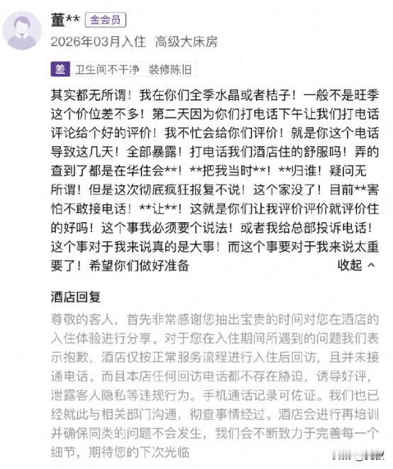 但对于酒店来说,这件事也提了个醒:回访客户固然重要,但也要注意方式方法。每个人都有自己的生活节奏,一通不合时宜的电话,哪怕不是这次闹剧的直接原因,也足够让人心里不舒服。