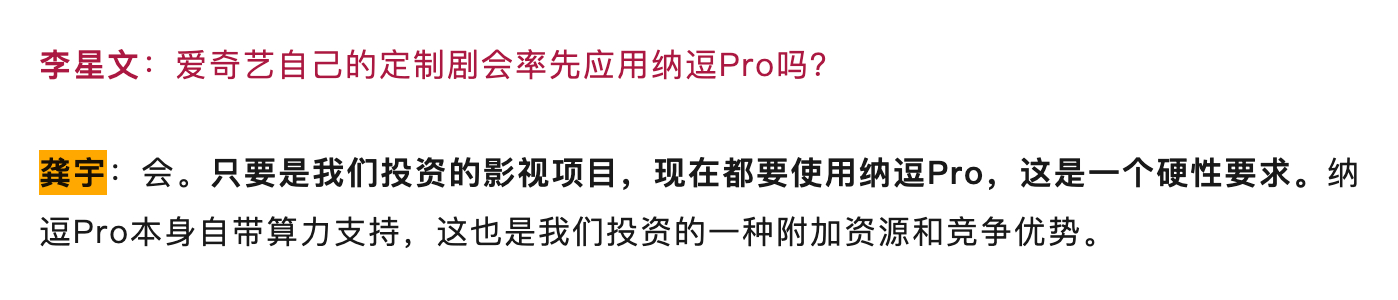 龚宇说爱奇艺投资的项目都要使用纳逗Pro 龚宇在4天前的采访说:“只要是我们投资的影视项目,现在都要使用纳逗Pro,这是一个硬性要求。”目前有不少演员在和他们洽谈“让真人演员先完成部分关键表演,然后通过三维扫描和动捕技术,将其数字化”这种商业模式。