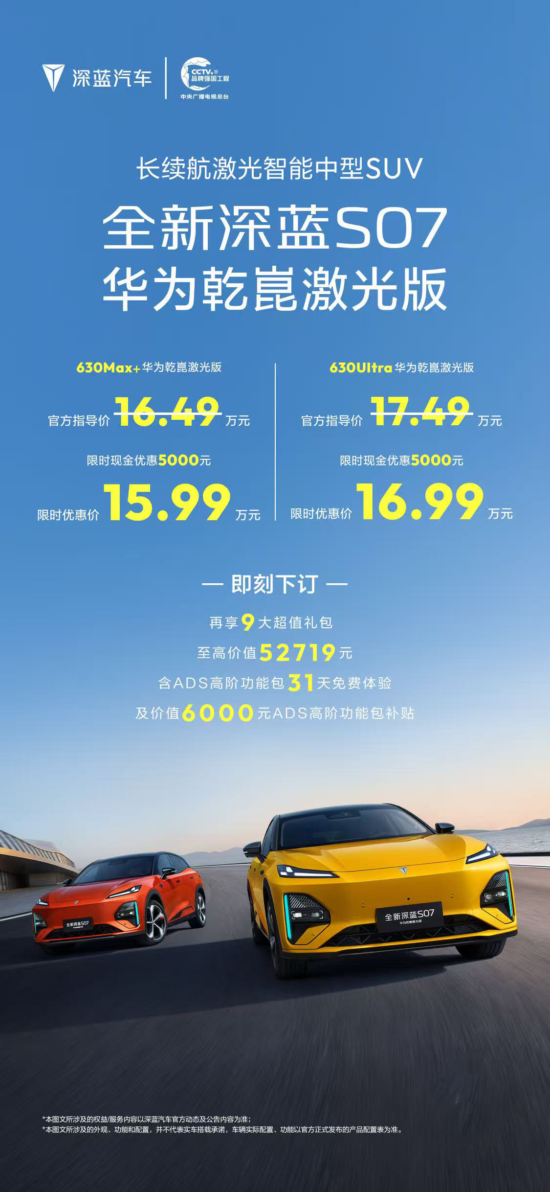 深蓝S07华为乾崑激光版上市,售价15.99万起,智驾升级至ADS 4 Pro。