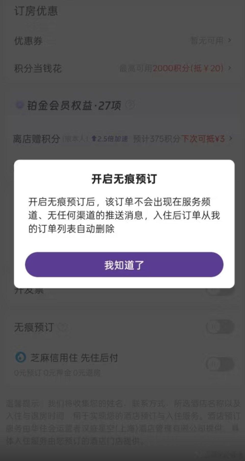 华住会回访受害者加1,据说华住会突然出了个开了无痕预定,开了以后不会有任何渠道推