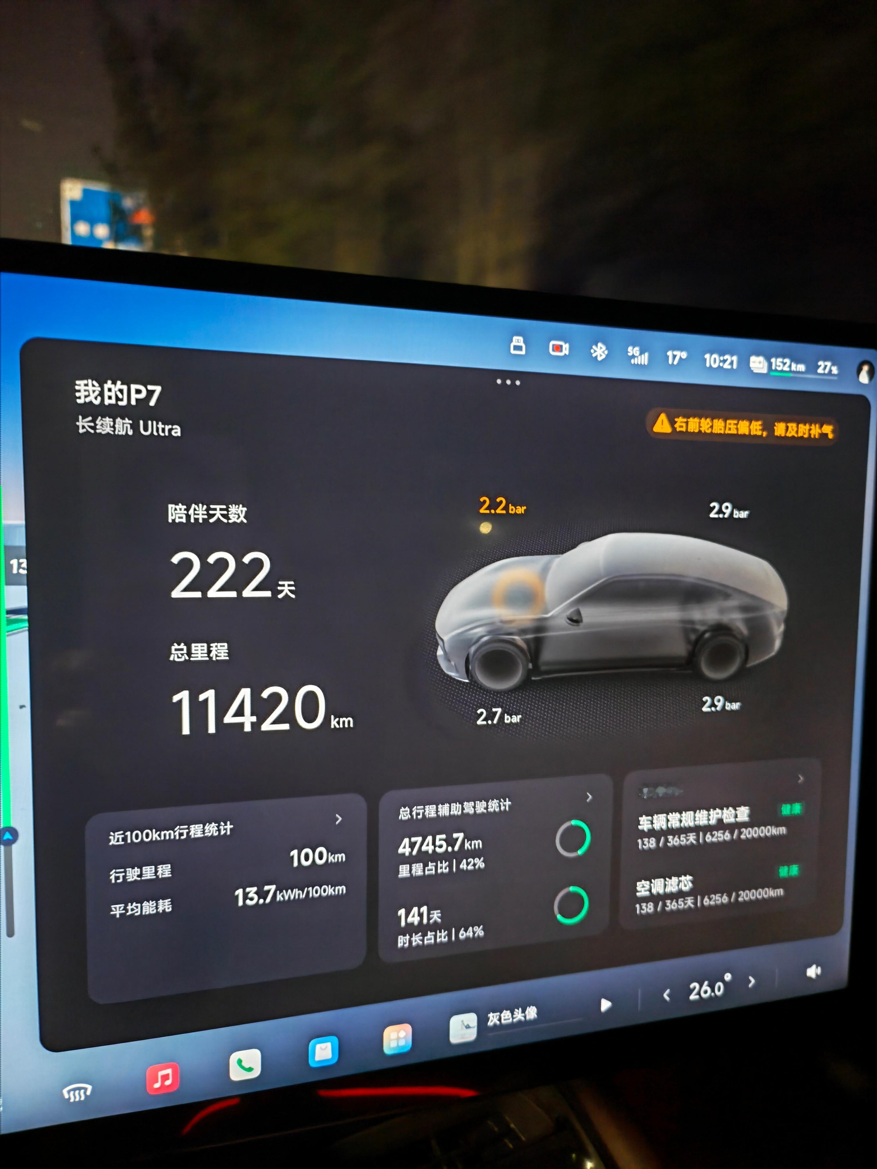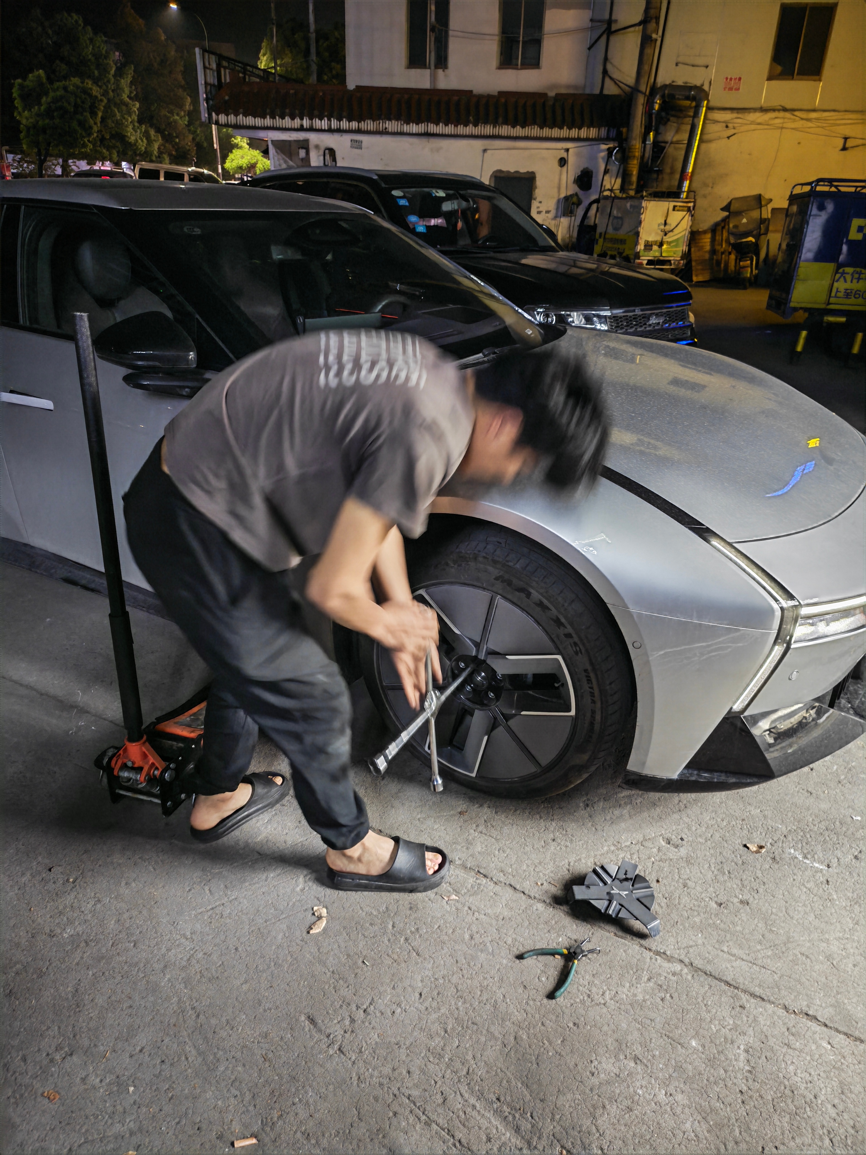 大晚上出来充电,轮胎扎破了,车子还没预警手机先弹窗了连忙找汽修店,辗转三家店,终于有一位好心老板开门帮我补胎了