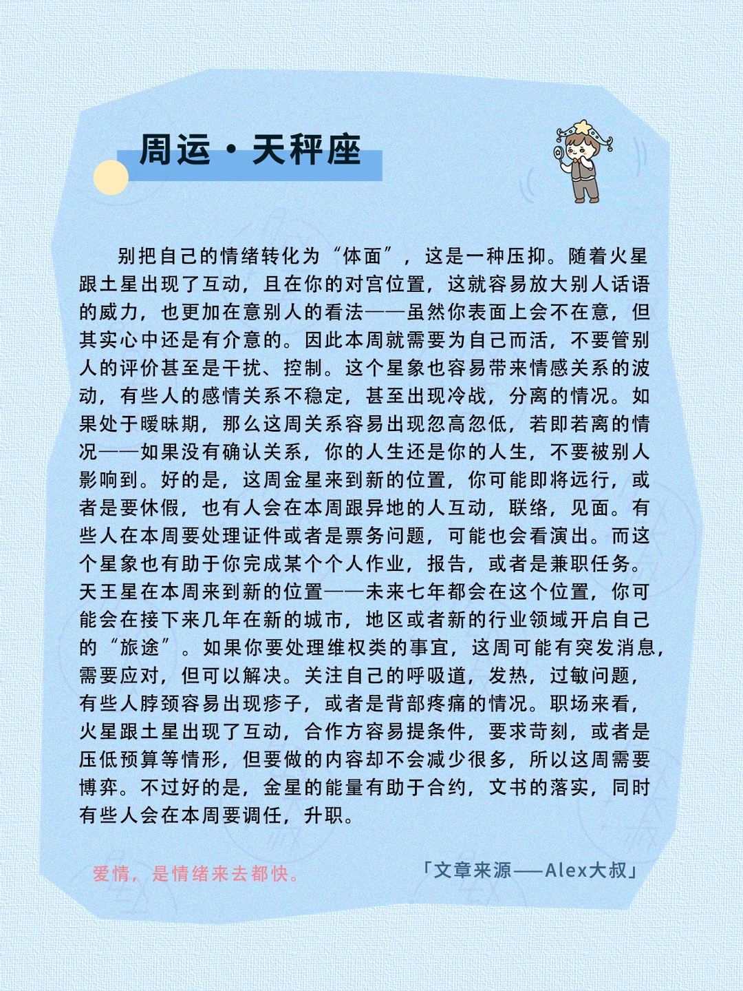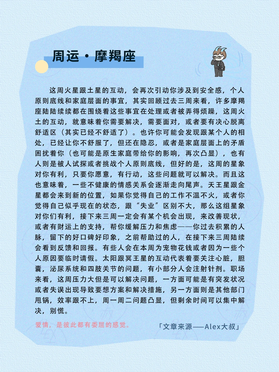 金星也跟金钱、价值有关系,而且太阳在本周来到了土象宫位——配合天王星的影响,也许这个时候我们会有一种危机意识,觉得自己现在技能不足,受限,导致我们不得不学点新的东西,接受一些新的观念——或者是承认现在的状况跟过去确实完全不同了,所以我们需要提升自己,改变自己,不管是学习还是别的方式,总之我们需要顺应时代潮流,做出一些改变,以此来避免被淘汰。