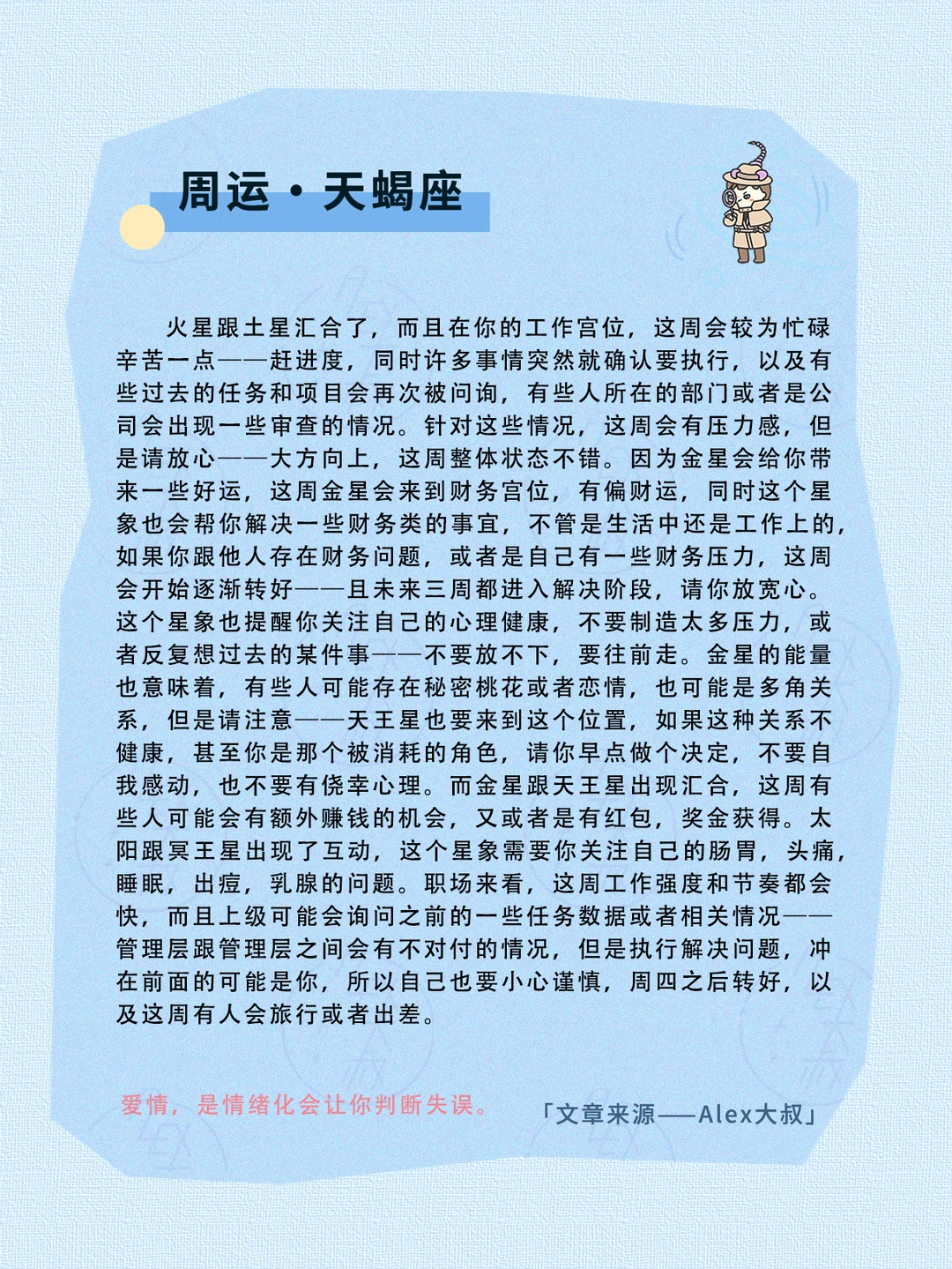 本周健康注意:关节不适,骨骼,牙齿,呼吸道,心率问题,血脂,扁桃体,睡眠。