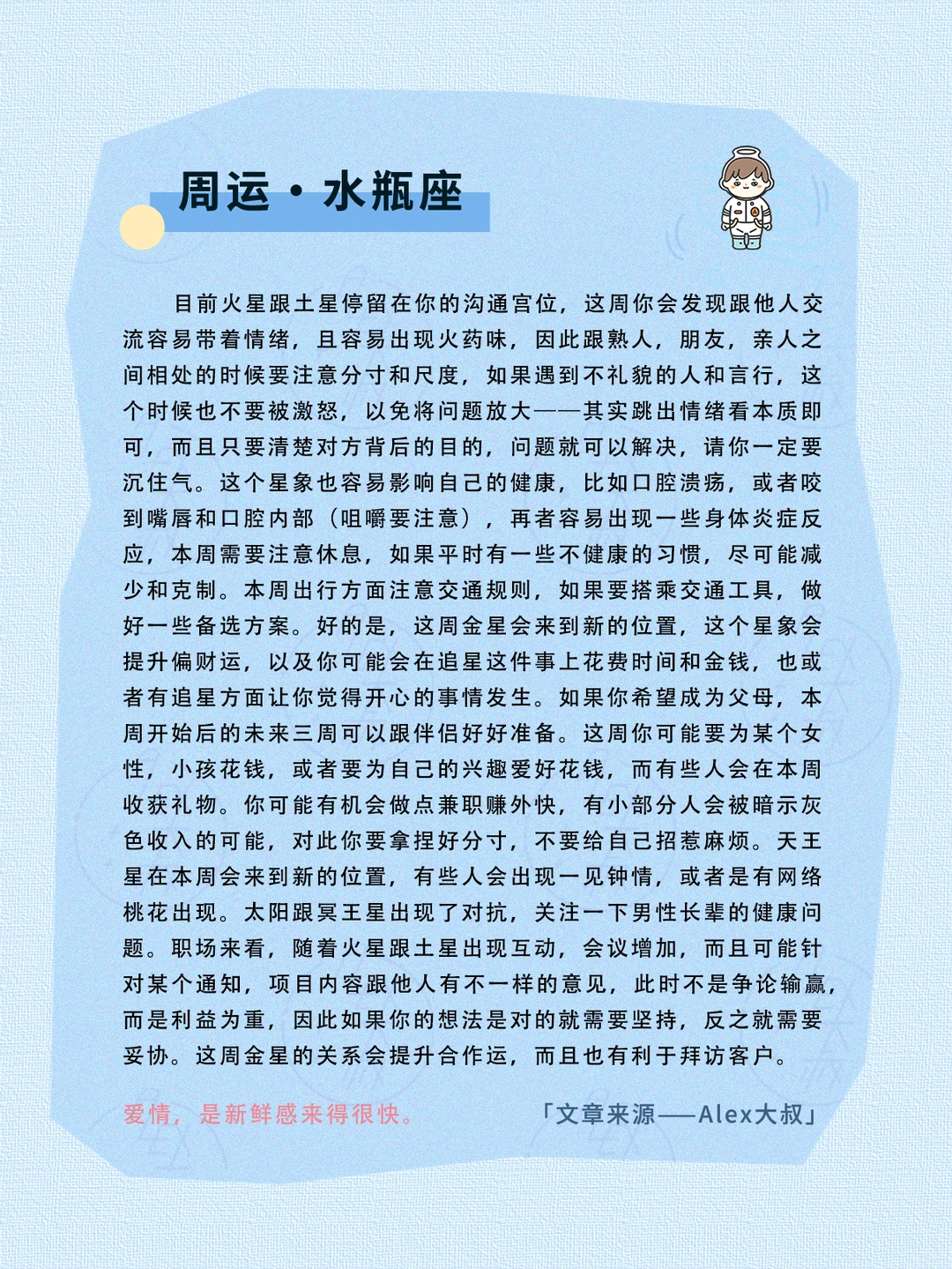 金星会在本周来到新的位置,而且跟天王星相遇——天王星在本周也会正式进入新的位置,并且在这个位置停留未来7年的时间。我相信这是一个感情关系变化较多的一段时间,可能身边人闪恋,闪婚,或者是闪分,闪离,这些情感方面的八卦消息会出现的格外多,包括一些公众人物的情感世界会被关注或者是——挖掘信息,串联线索,让人浮想联翩,也可能是有些公众人物的情感关系出现变化,引发我们的关注和讨论。