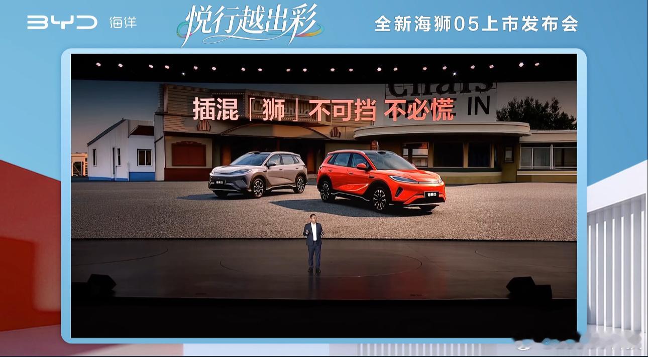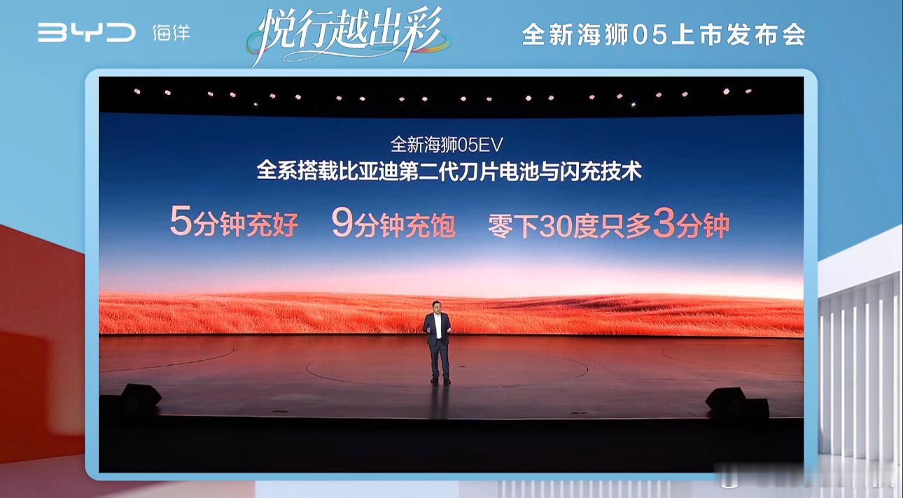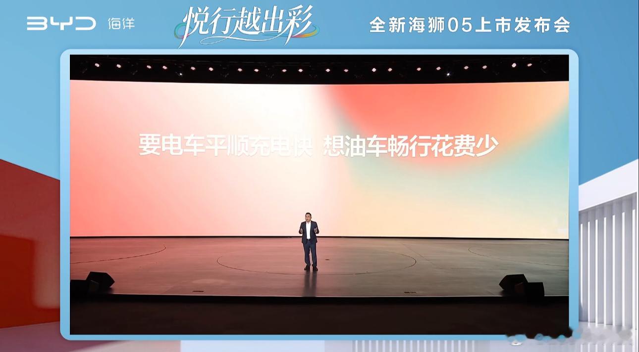 悦行越出彩全新海狮05 上市发布会开始类了!海狮05让充电不再等待了!这才是考虑我们消费者的,最好的的考虑!EV纯电版:搭载第二代刀片电池与闪充技术,CLTC续航630km,支持5分钟充好、9分钟充饱的极速补能!DM-i插混版:采用第五代DM技术,纯电续航305km,综合续航达2105km,亏电油耗仅3.1L/100km!