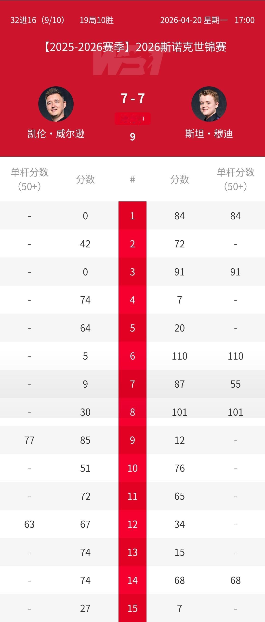 隔壁的囧哥差点陷入3-8落后局面,第11局斯坦穆迪延分状态打丢贴库的超分红球,凯伦威尔逊上手清台。两人重置黑球,囧哥秀出远台准度极限绝杀。随后囧哥连胜3局,将比分扳平7-7,一切皆有可能了。
