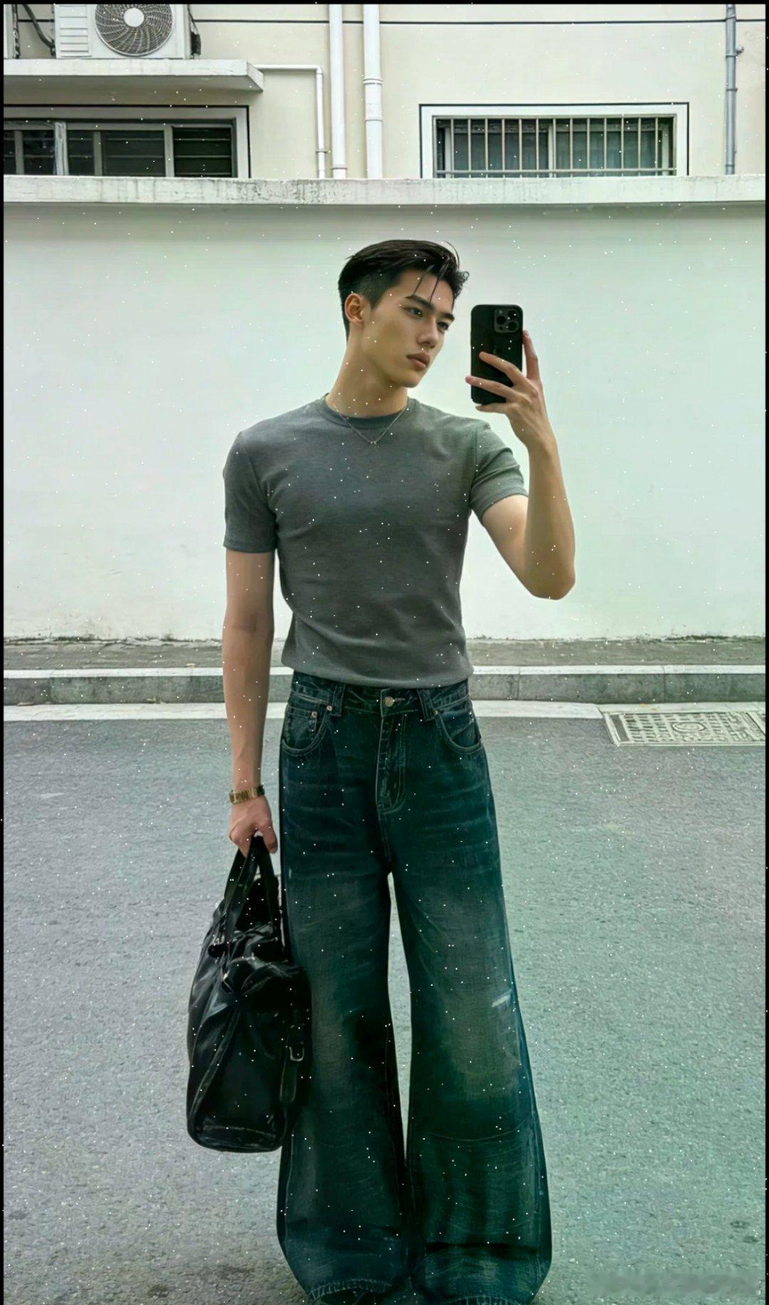 人的心情是可以突然变好的穿搭就会有好心情。灰短袖自带软糯肌理感,弱化硬朗线条; 深蓝阔腿裤垂坠松弛,高腰版型藏肉显比例,做旧细节增添复古温柔感; 黑托特包+皮鞋平衡色调,整体干净温柔,通勤日常都适配 韩系穿搭[话题]温柔少年感[话题]男生cleanfit[话题]轻熟风穿搭[话题]灰色系穿搭[话题]男生穿搭[话题]休闲牛仔裤这么搭[话题]