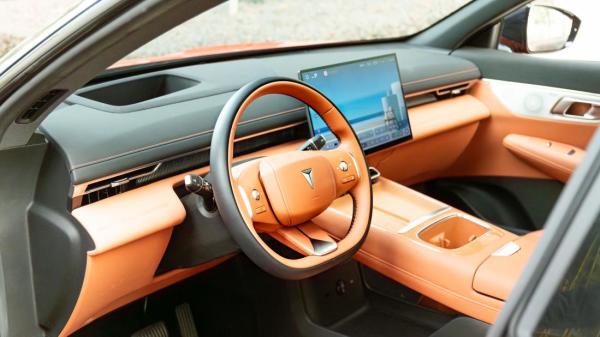 中控屏为15.6英寸2.5K向日葵屏,向左向右各能旋转15°,且具备防指纹涂层保证清晰度。还有10.25英寸仪表盘和55英寸AR-HUD抬头显示,看导航信息不用低头,智驾和安全提示也直接投射到前挡风玻璃。