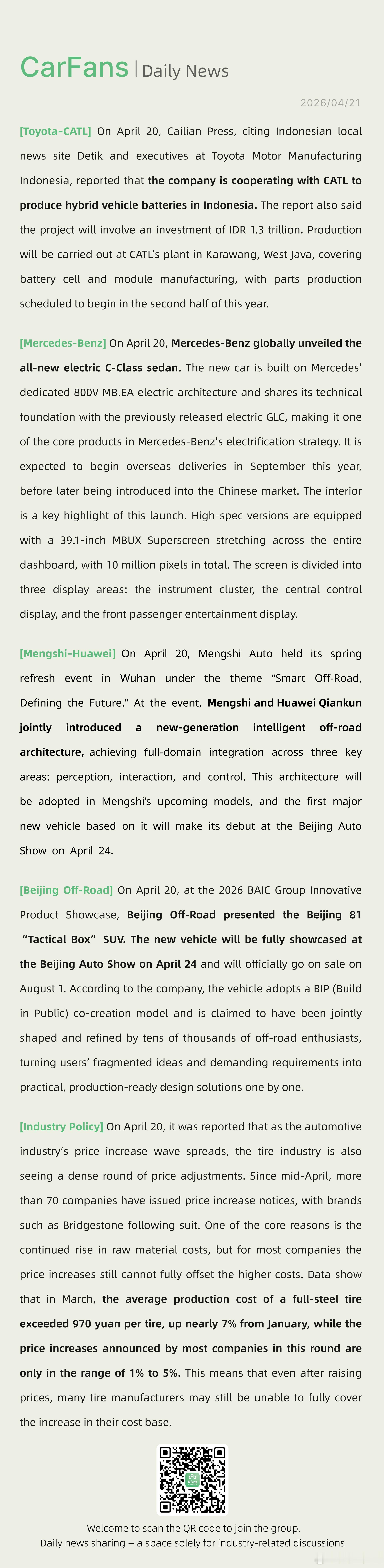 丰田正与宁德时代合作在印尼生产混动电池轮胎行业也迎来密集调价汽车产业“涨价潮”蔓延,轮胎行业也迎来密集调价,4月中旬以来超70家企业发布“涨价函”,普利司通等集中跟进。