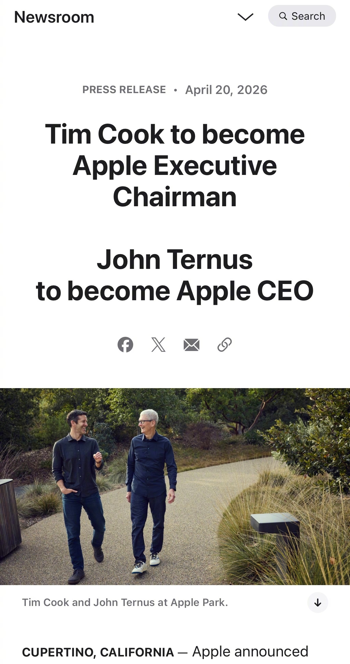 Tim Cook宣布将在 2026 年 9 月 1 日卸任 CEO,转去做董事会执行主席。简单来说就是:不再管日常运营,但还是会继续参与更高层的决策。
