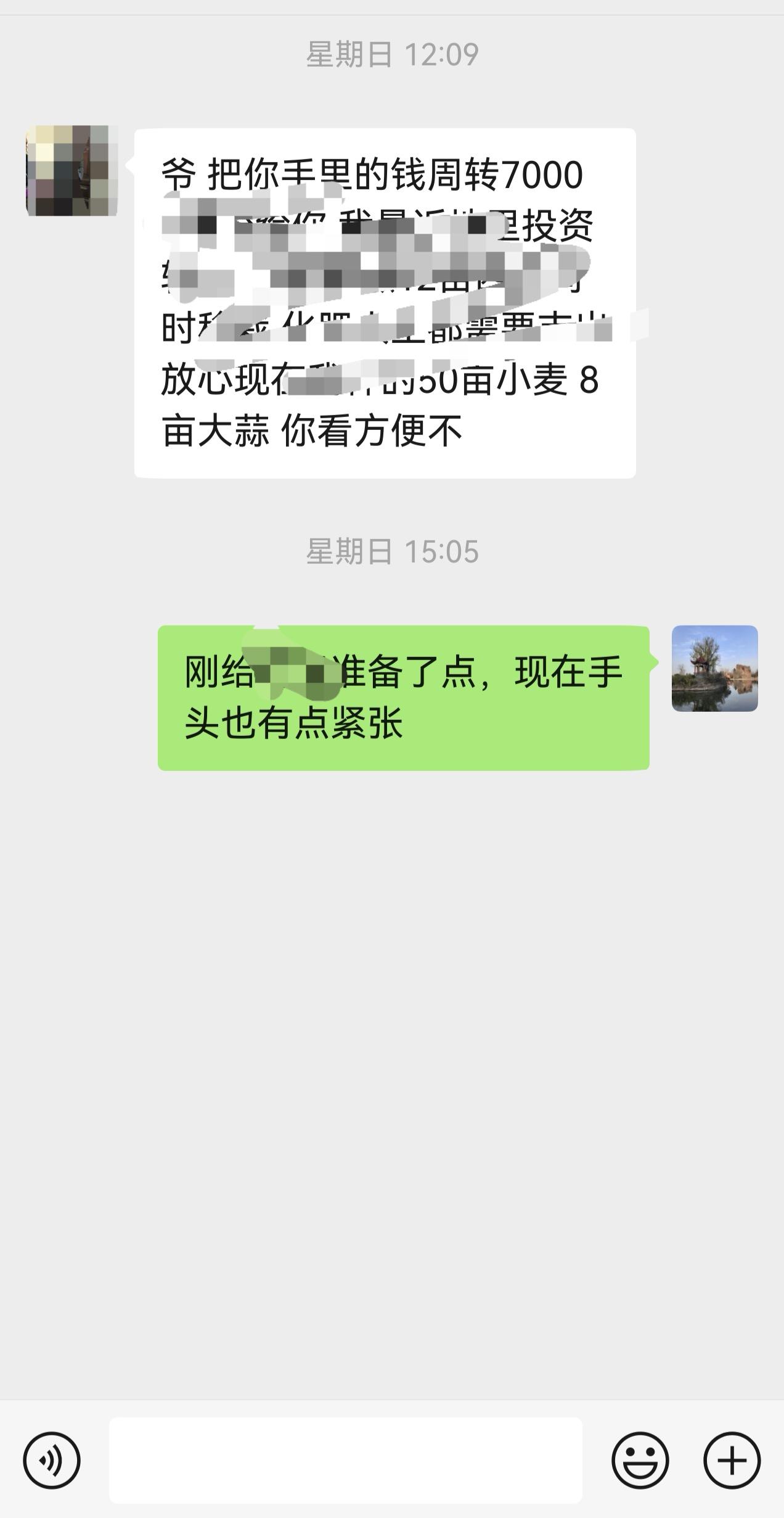 4月19日,本村一个晚辈给我发来微信,说他投资了30亩辣椒、12亩西瓜,还要雇佣人工,资金周转不开,让我先给他周转7000块钱,用三个月,到7月份还给我。我说刚给堂弟准备了点,现在手头也有点紧张。这家伙竟然不再回短信了。哈哈,脾气不小。