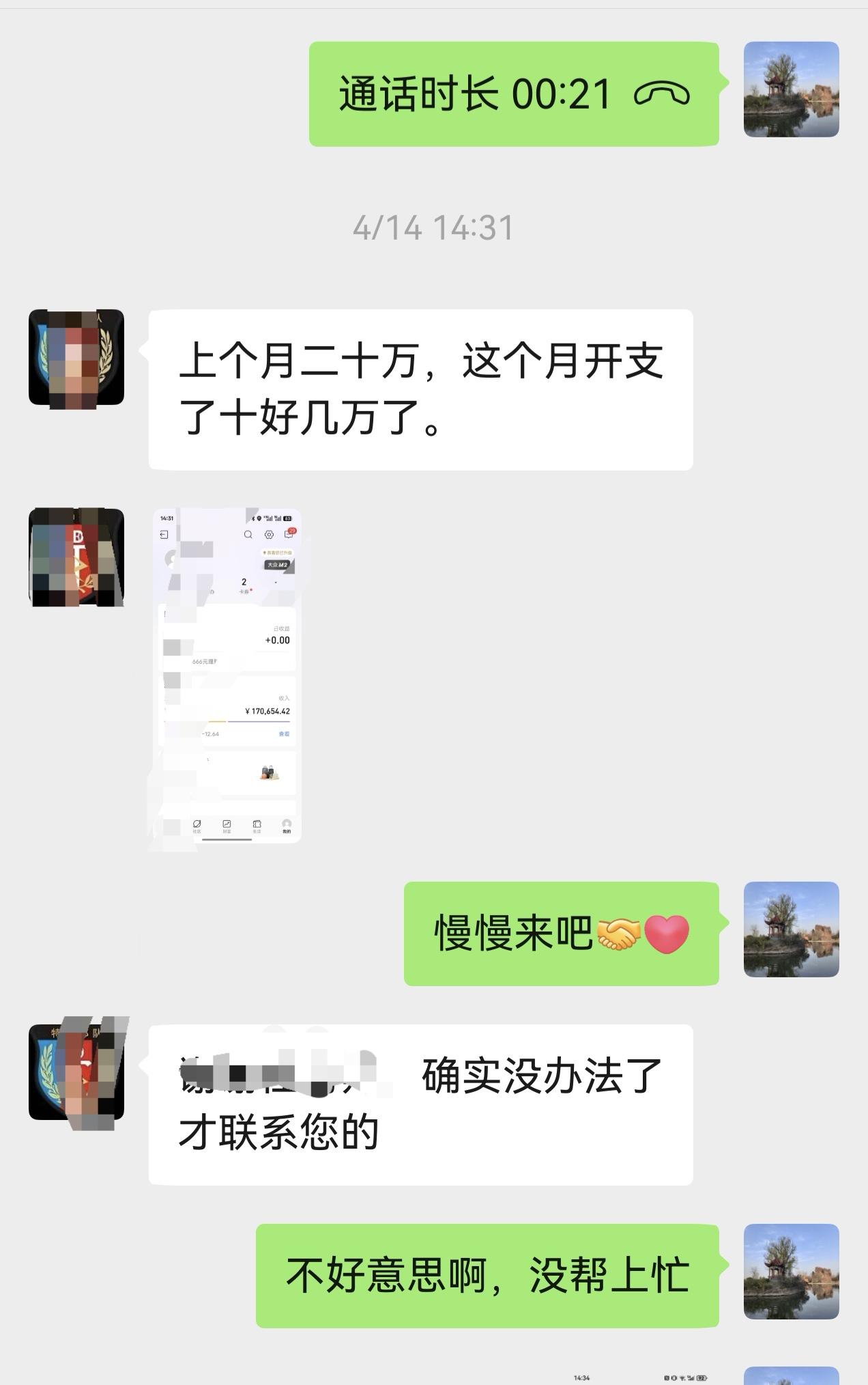 4月14日,一个朋友打来电话,说是上个月支出20多万,这个月支出十几万,实在没钱了,让我给他准备点。我耐心给他解释了一下去年和今年的财务支出情况,表示爱莫能助。他很客气的说,仍然谢谢我。