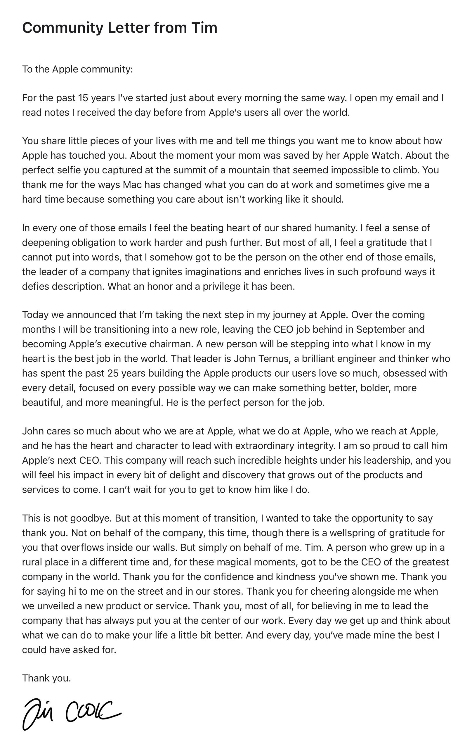 这不是告别。但在这个过渡的时刻,我想借此机会说一声谢谢。这一次,不是代表公司——尽管公司内部对你们的感激之情如泉涌般满溢——而仅仅是代表我自己,Tim。一个来自不同时代、乡村之地长大的人,在这些神奇的时刻,成为了这家世界上最伟大公司的 CEO。感谢你们给予我的信任和善意。感谢你们在街头和我们的店里向我打招呼。感谢你们在我们发布新产品或服务时与我一同欢呼。最要感谢的是,你们相信我能领导这家始终把你们放在工作中心的公司。每一天,我们起床后都在思考,能做些什么让你们的生活变得更好一点。而每一天,你们都让我的生活成为了我所能期望的最好模样。