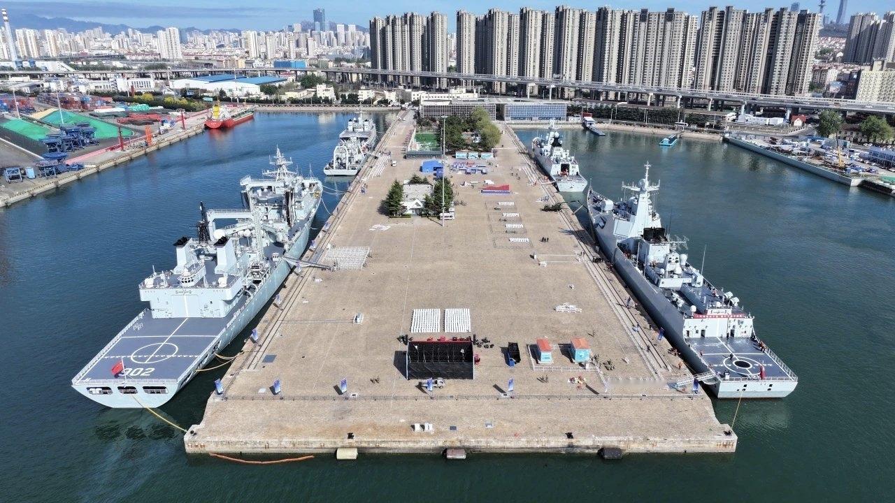 4.23海军节将至,天气不错,青岛某港舰队集结,准备开放参观活动。