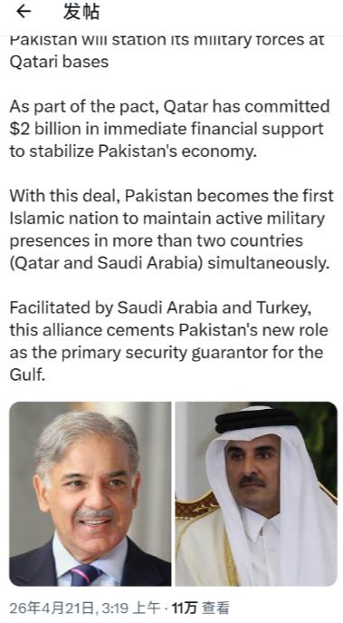 其实完全不用担心,因为除了卡塔尔的20亿美元,沙特也给了它资金支持,两国联手注入的援助,不仅能覆盖驻军成本,还能帮巴基斯坦偿还债务、升级军事装备,等于卡塔尔和沙特出钱,巴基斯坦出兵力,三方各取所需。
