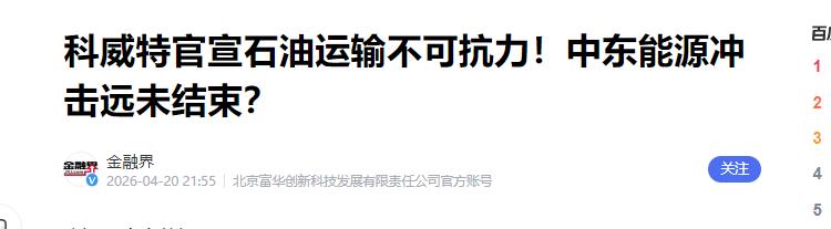 信息来源:《科威特官宣石油运输不可抗力!中东能源冲击远未结束?》,金融界,2026年4月20日。