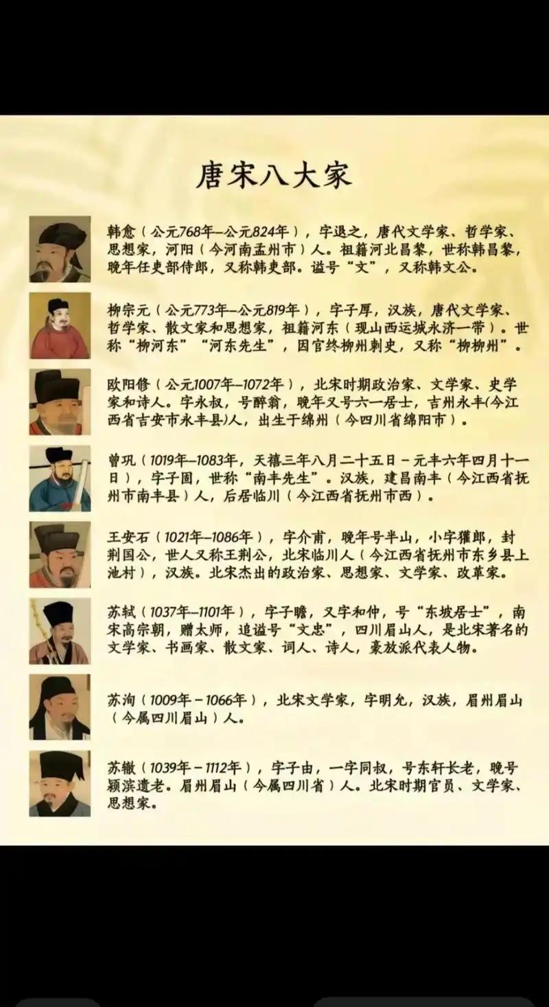 有趣知识点:苏洵和苏轼、苏辙一家占了3席;曾巩、苏洵、苏轼、苏辙、王安石都得到了欧阳修的提携,甚至有师生关系。