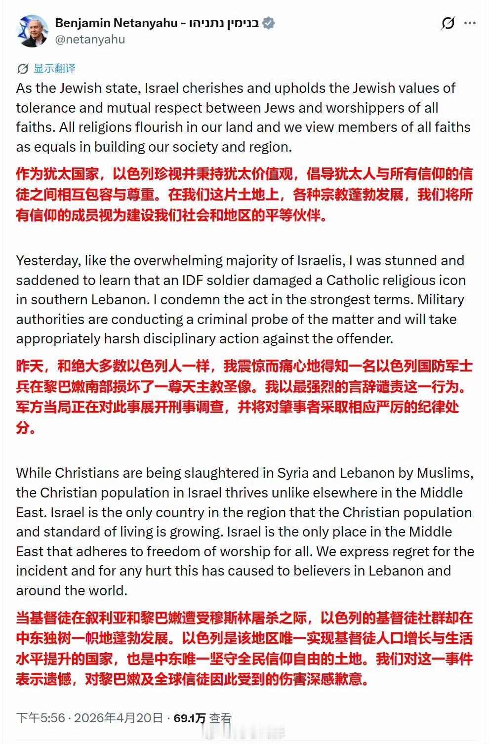 【以总理向全球基督徒道歉】以军士兵砸基督教雕像的事儿闹大了,刚才内塔尼亚胡发了一