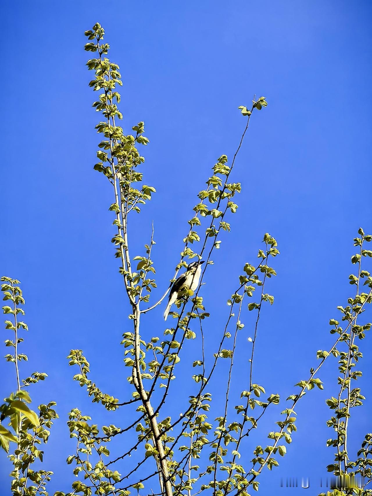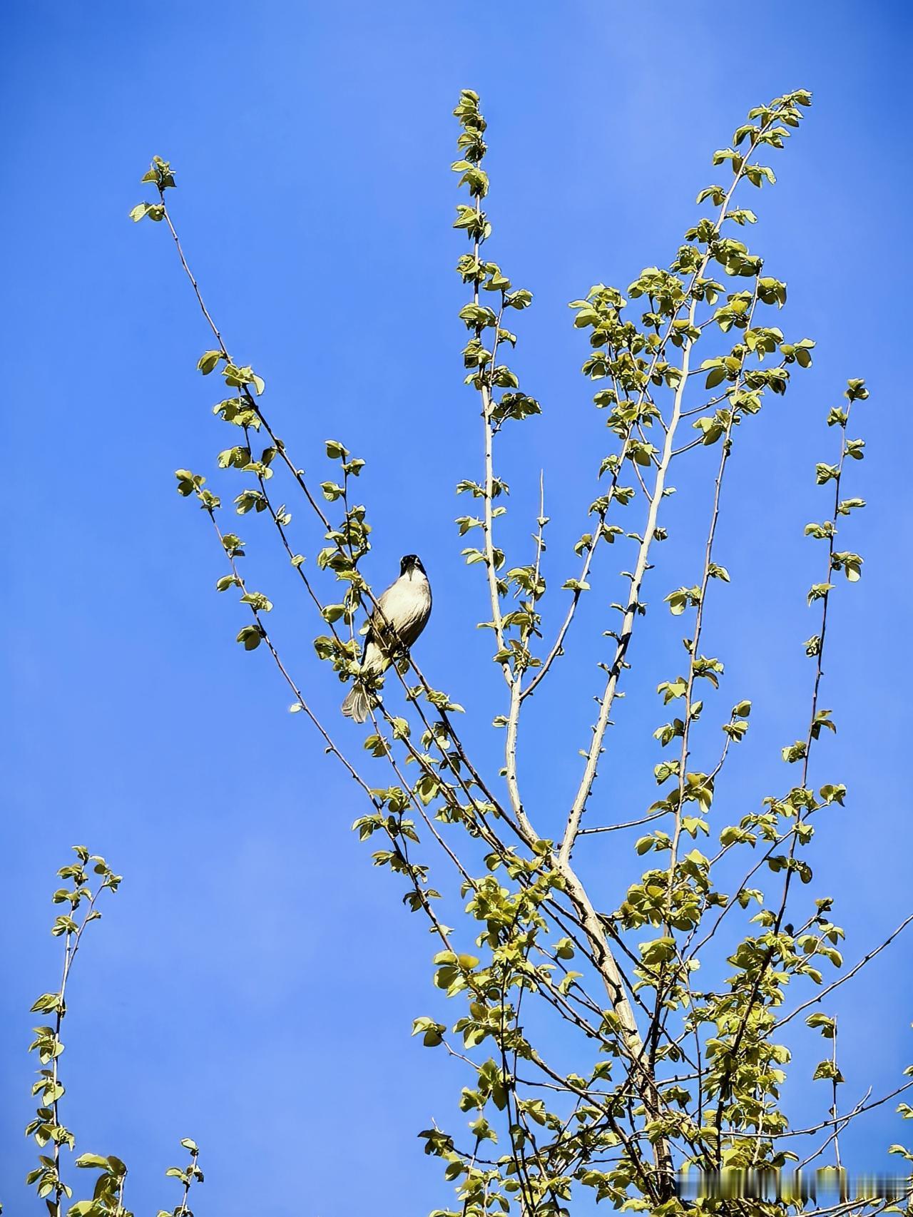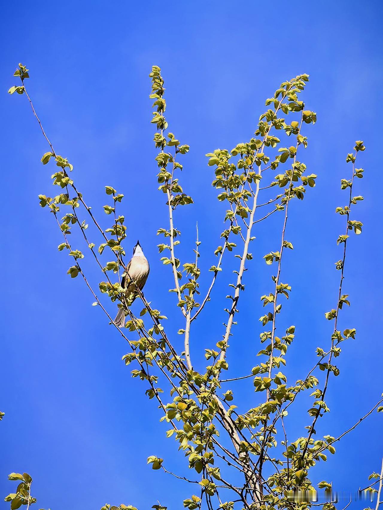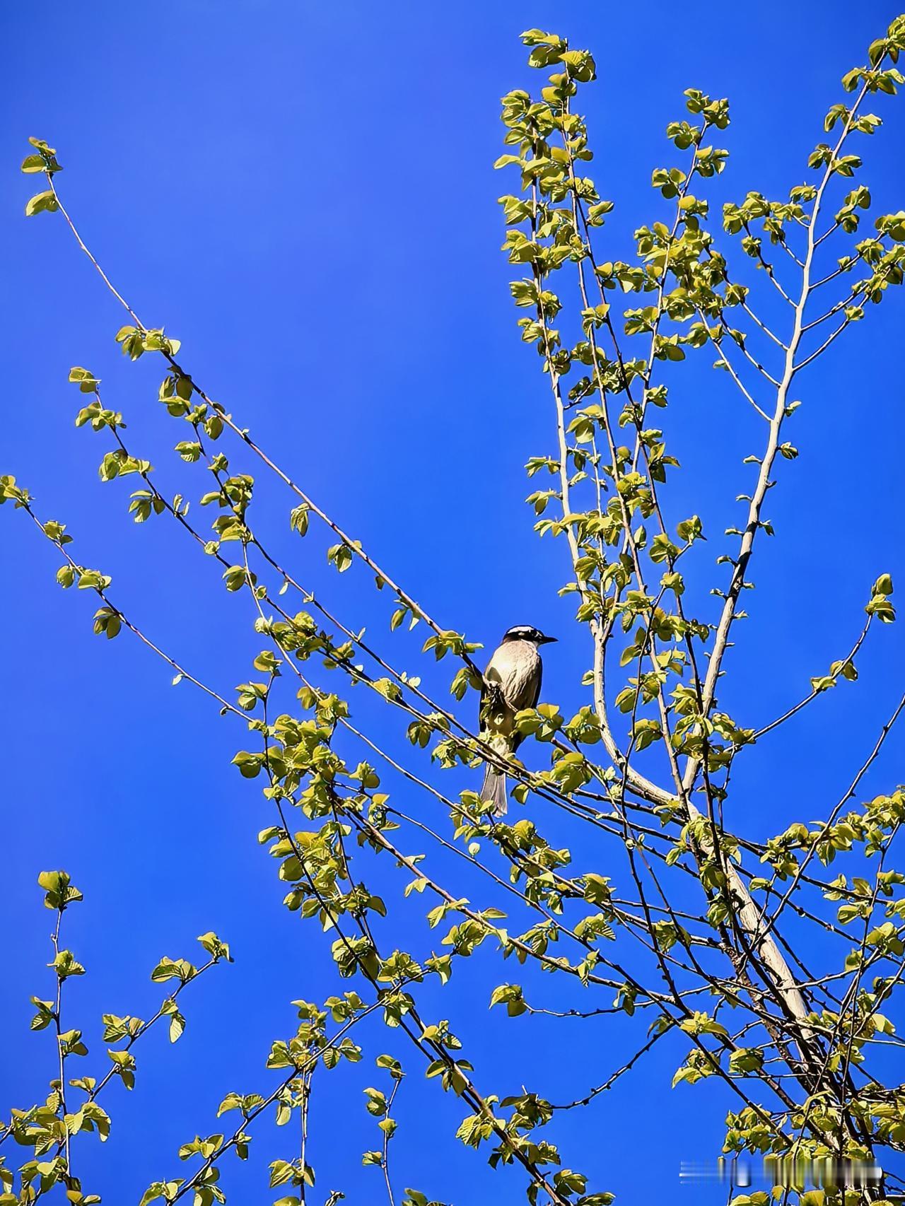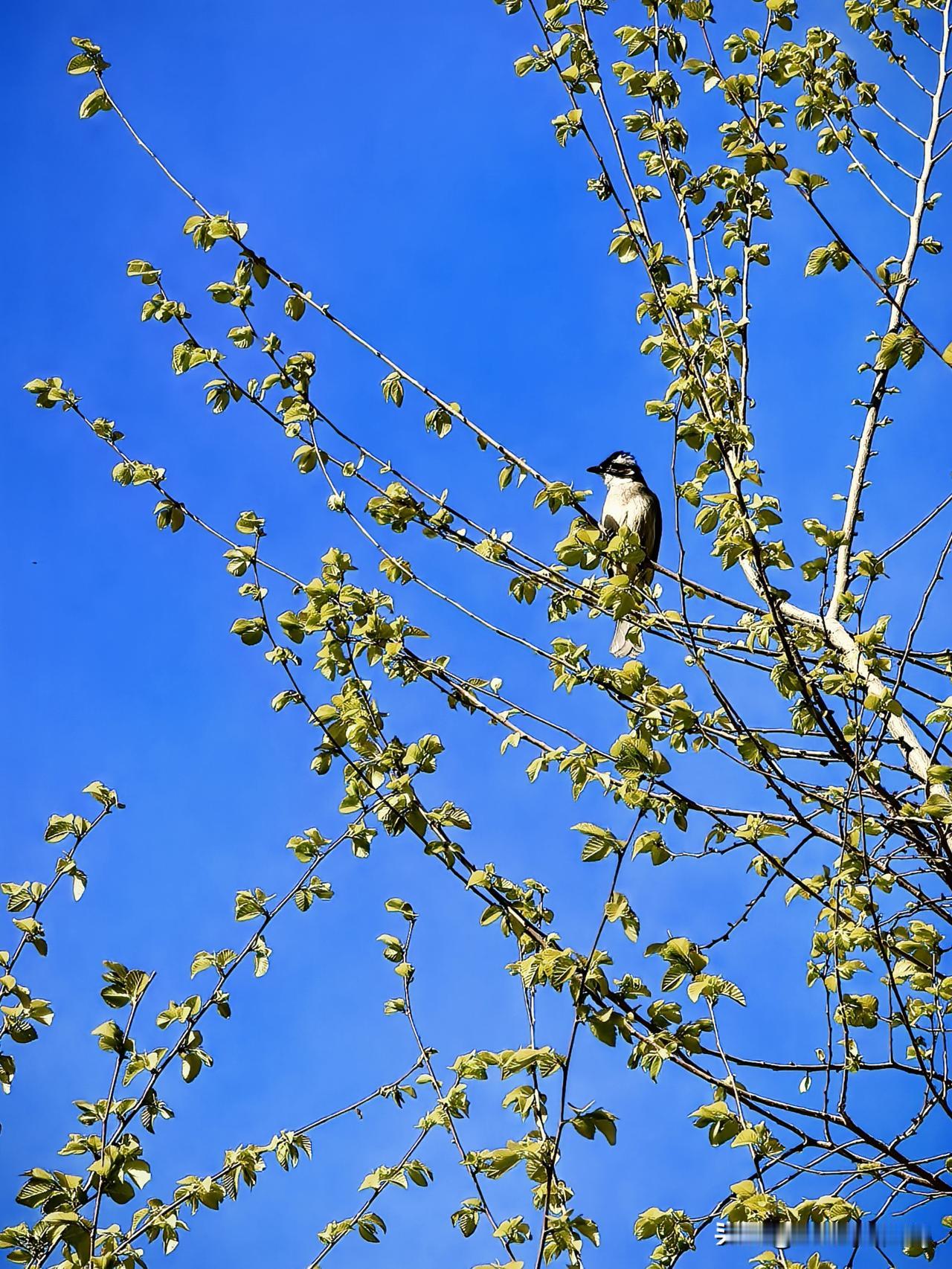 晒图笔记大赛小区里又来了新邻居——蓝天新枝上,白头鹎静静伫立,一身清鸣,撞碎了春