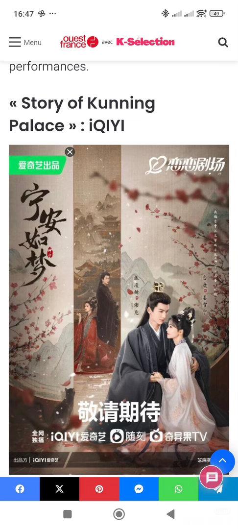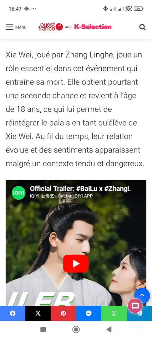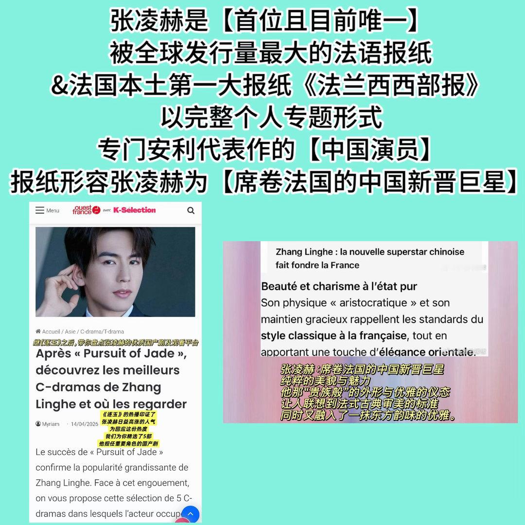 《法兰西西部报》,为张凌赫专门发文设立了专题安利!形容凌赫为【席卷法国的中国新晋巨星】这是全球发行量最大的法语报纸,也是法国发行量最高的付费日报【法国本土第一大报纸】,张凌赫是【唯一】一个被法国第一大报纸《法兰西西部报》完整个人专题形式专门安利代表作的【中国演员】