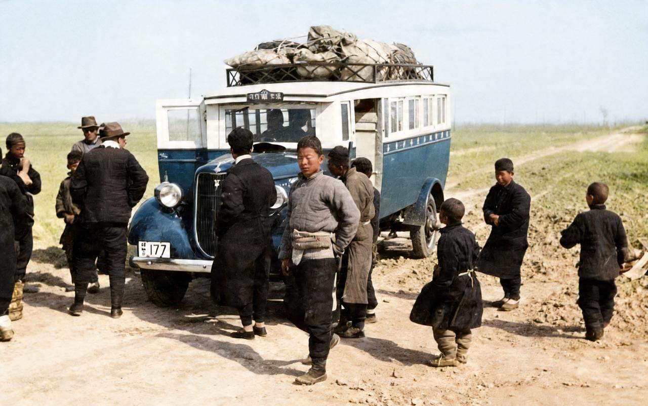 这是民国时期一辆公交车在路上抛锚。乘客在车上待不住了下车透透气。当时,公交车的司