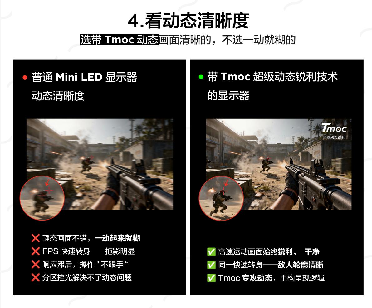 为解决传统高刷显示器“快却模糊”的通病,TCL C3A Pro 搭载 Tmoc 超级动态锐利技术,通过面板、液晶加速与矩阵背光协同优化,有效消除拖影与伪影。实际体验中,无论是在 FPS 拉枪,还是MOBA 走位等高速场景中,画面始终清晰锐利无模糊,彻底告别动态模糊与拖影残留,让高刷优势真正转化为 “快且清晰” 的跟手体验。