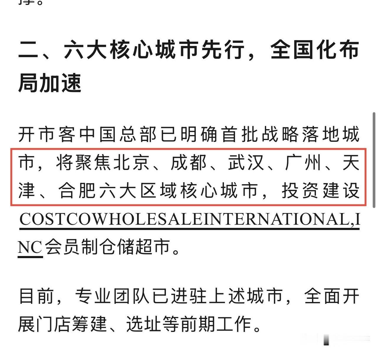 开市客中国总部已明确首批战略落地城市,将聚焦北京、成都、武汉、广州、天津、合肥六大区域核心城市,投资建设COSTCOWHOLESALEINTERNATIONAL,INC会员制仓储超市。