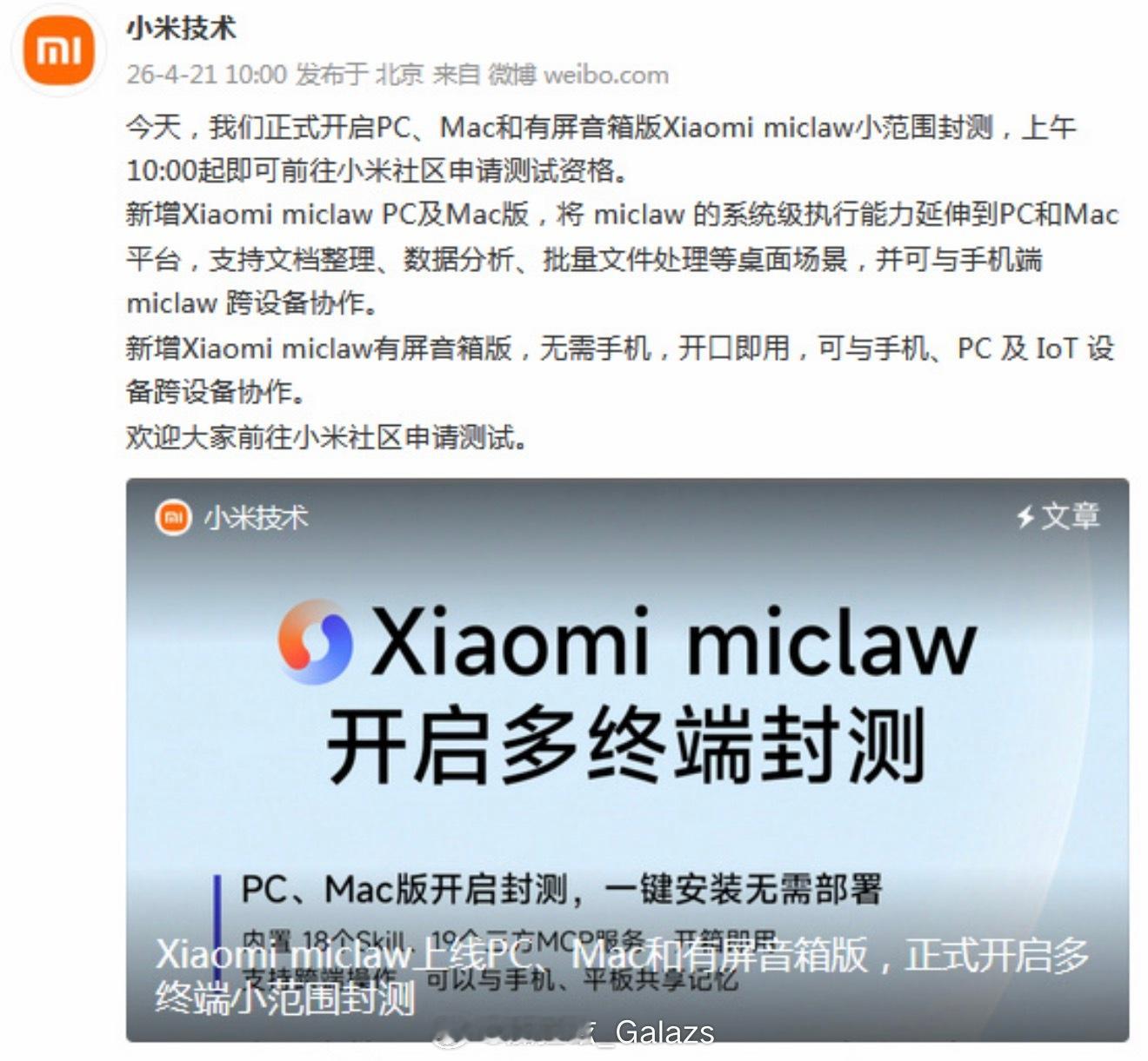 小米发布PC和Mac版龙虾 哇!!PC、Mac还有有屏音箱版miclaw小范围封测启动了!粮厂这落地速度怎么越来越快,我没记错的话是从手机端龙虾上线才一个多月,就把平板、PC、音箱全铺满。行业里也就这一家真把人车家全生态打通了,简称「全生态龙虾」。我觉得更猛的是它还直接上MacBook!手机车机跨苹果,现在连龙虾都无缝兼容,这格局,搁这儿呢!苹果AI国行落地慢,Mac版龙虾powered by Xiaomi,帮你解决,能做到一句话就调度手机、智能家居干文档、数据分析、批量处理,桌面任务直接起飞。我个人觉得,这不是简单适配,而是把生态主动权握在自己手里。而且你看底座MiMo大模型本来就第一梯队,V2-Pro在OpenRouter霸榜一个月,现在龙虾多端开花,正好管用。这波我真心服,国产AI不是喊口号,是真在跑。