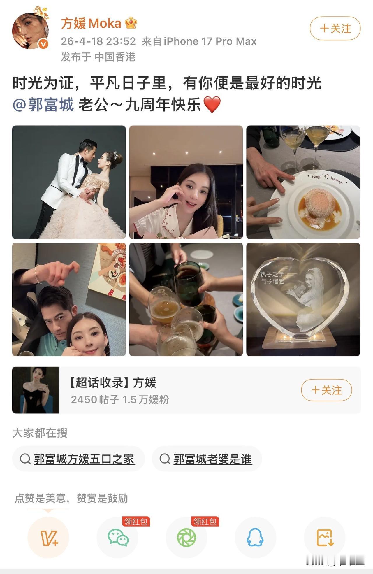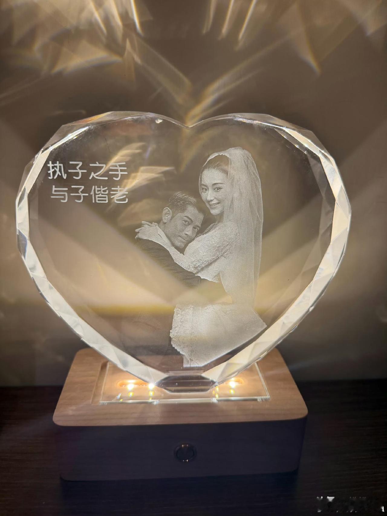 4月18日,郭富城晒照庆结婚9周年,配文"长长久久",还特意发了张方形水晶摆件的live图,刻着两人婚纱照与"愿有岁月可回首"。方媛紧随其后晒心形款,配文"平凡日子里有你便是最好的时光",画面温馨到让人羡慕。