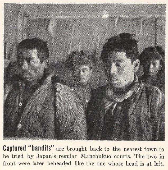 这张照片来自海外旧画报原版扫描件,附带同期英文原始配文,无后期篡改:Captured "bandits" are brought back to the nearest town to be tried by Japan’s regular Manchukuo courts. The two in front were later beheaded like the one whose head is at left.