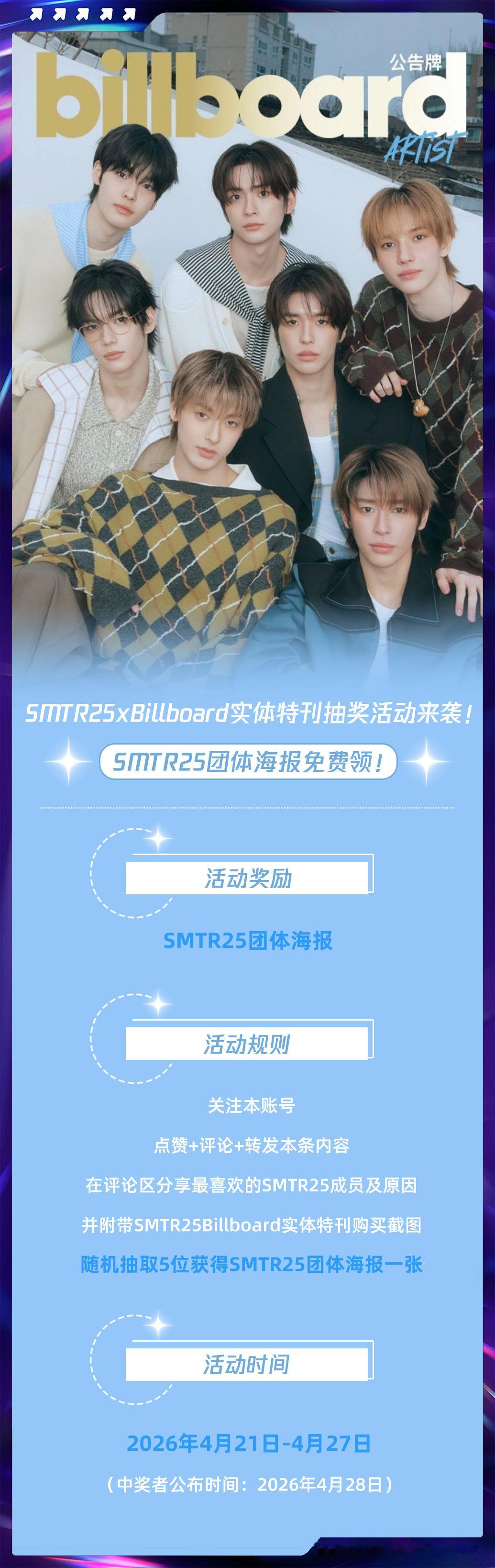 惊喜福利同步上线!SMTR25 Billboard实体特刊专属抽奖活动火热开启📣参与方式超简单:1️⃣关注本账号+点赞评论转发本条内容2️⃣在评论区分享最喜欢的SMTR25成员及原因并附上SMTR25Billboard实体特刊购买截图