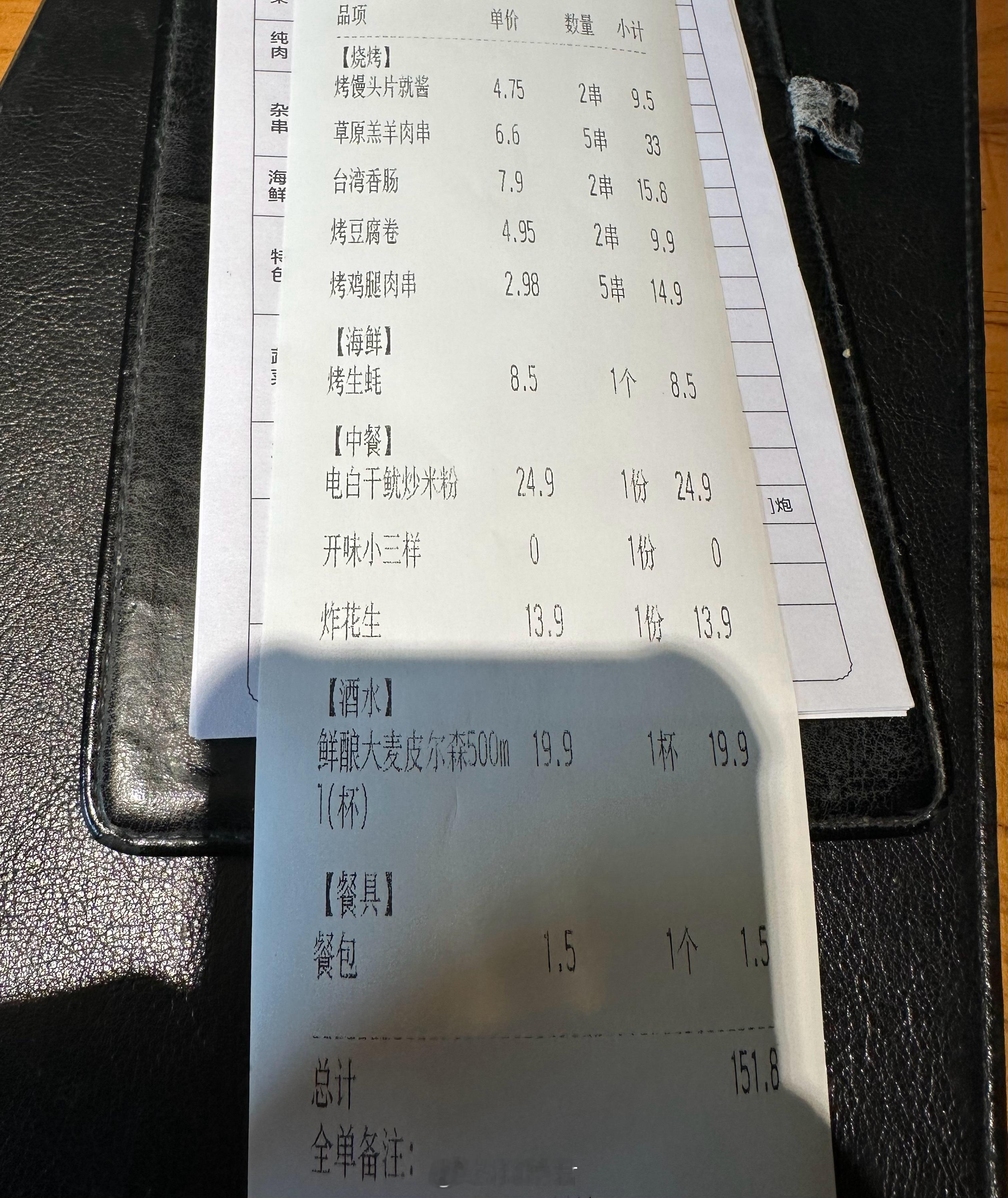 好几年没吃木屋烧烤了,今天想吃就去吃了,物价上涨了吧,感觉价格比以前贵了点,一个人花了151块钱,大家看看菜单,这价格是不是贵了