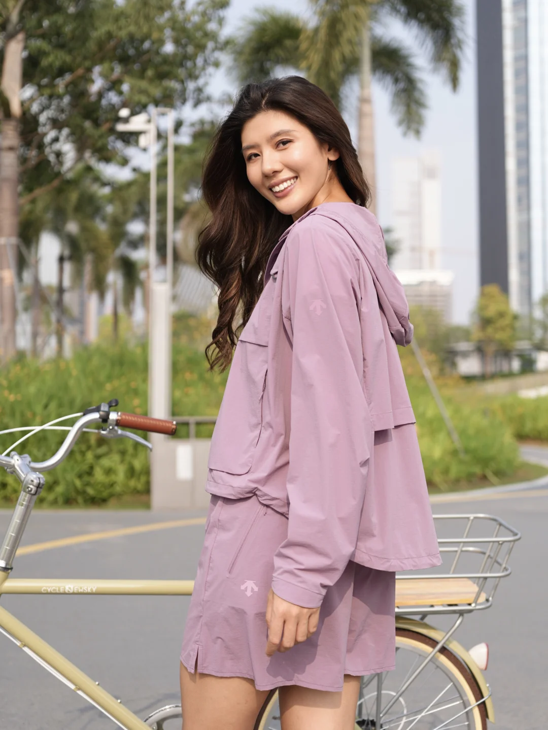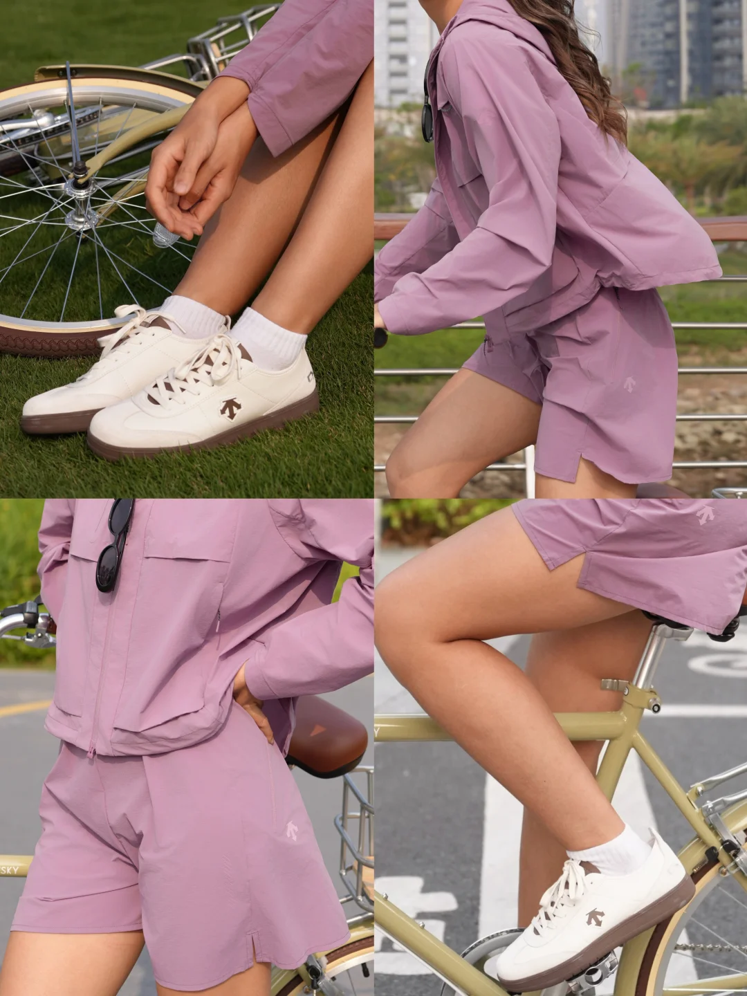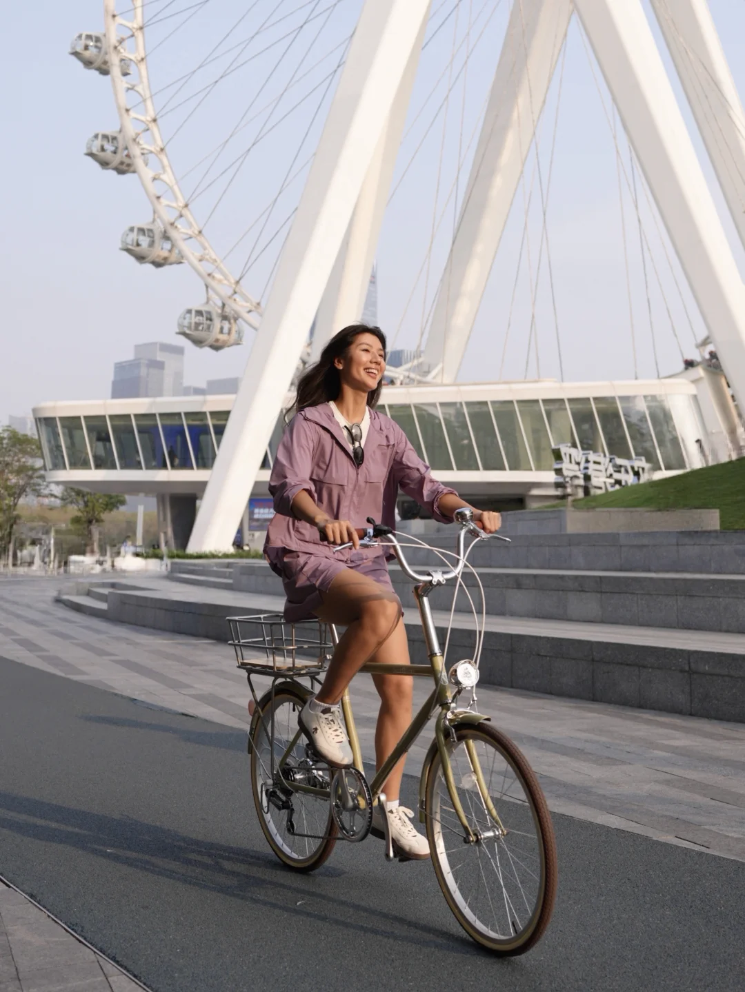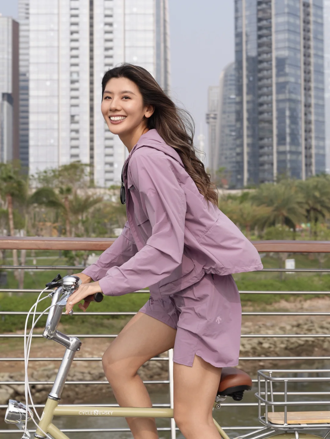 面料轻肤到几乎忘记它的存在,过弯、刹车、迎风踩踏时完全不受束缚。外套自带防UV,傍晚的紫外线还没散尽也让人安心。