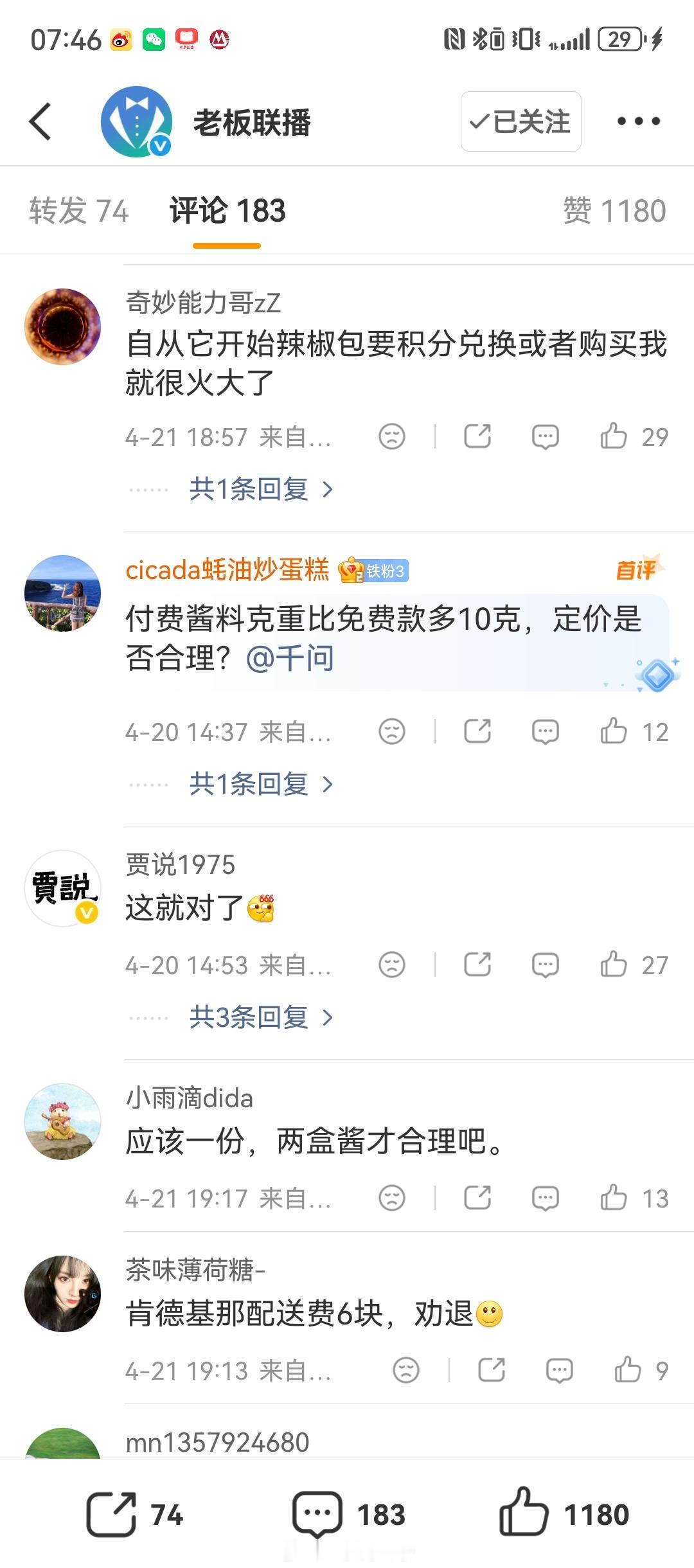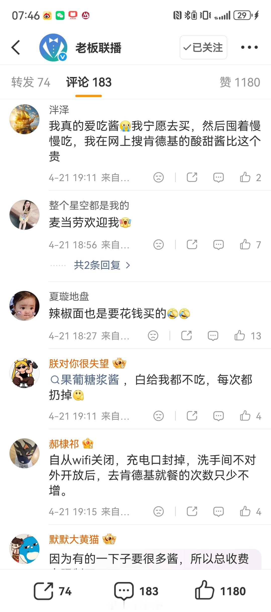 肯德基多要酱收费从4月20日开始,全国多门店执行新规,买黄金鸡块只默认送1盒20g免费蘸酱,多要就得花钱买!苏州、深圳门店都证实,额外的圆形盒装酱料一盒1.2元,分量比免费的多10g,店员说能避免浪费。深圳门店最多可备注多给1盒免费酱,要是要十几二十包,直接不给免费的了!以后吃鸡块再也不能疯狂蘸酱了,这波操作你们能接受吗?