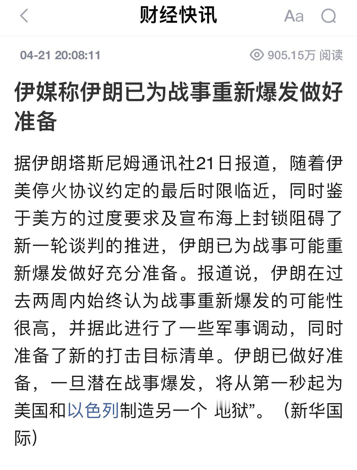 据伊朗塔斯尼姆通讯社21日报道,随着伊美停火协议约定的最后时限临近,同时鉴于美方的过度要求及宣布海上封锁阻碍了新一轮谈判的推进,伊朗已为战事可能重新爆发做好充分准备。报道说,伊朗在过去两周内始终认为战事重新爆发的可能性很高,并据此进行了一些军事调动,同时准备了新的打击目标清单。伊朗已做好准备,一旦潜在战事爆发,将从第一秒起为美国和以色列制造另一个“地狱”。