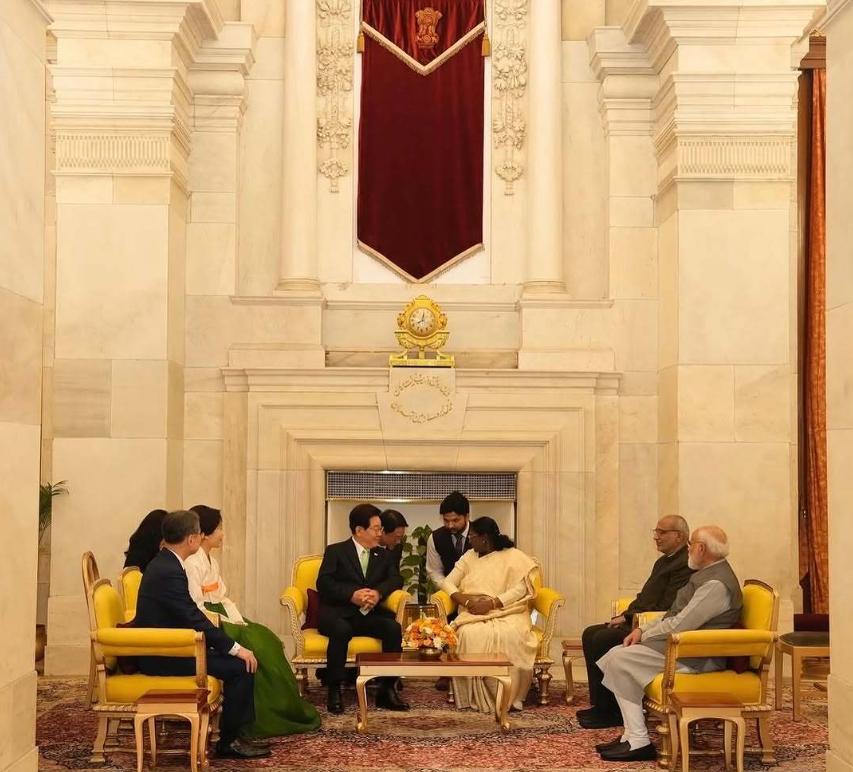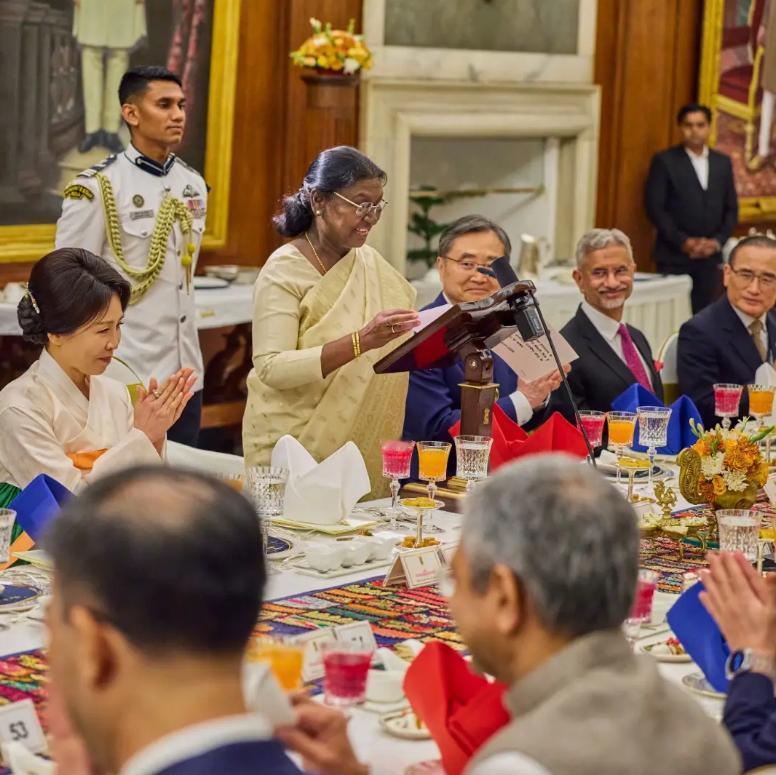 韩国第一夫人在印度穿传统服饰太美啦!4月20日金惠景穿韩国传统服饰在印度出席欢迎晚宴,白色与绿色搭配的韩服裙美得光彩照人,还用橙色丝带点缀,这身新造型很有辨识度,还尽显端庄!