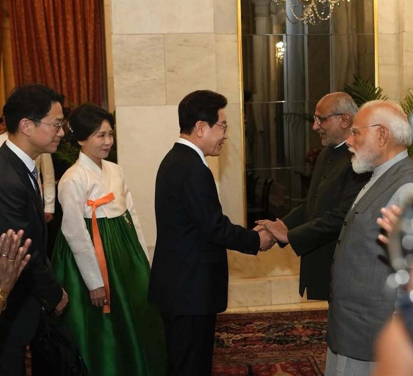 这件撞色韩服裙,裙摆的色彩十分靓丽,夫人扮嫩毫无违和感,尽管与李在明没有穿情侣装,但领带的颜色与夫人的裙装颜色相呼应,夫妻俩很般配。