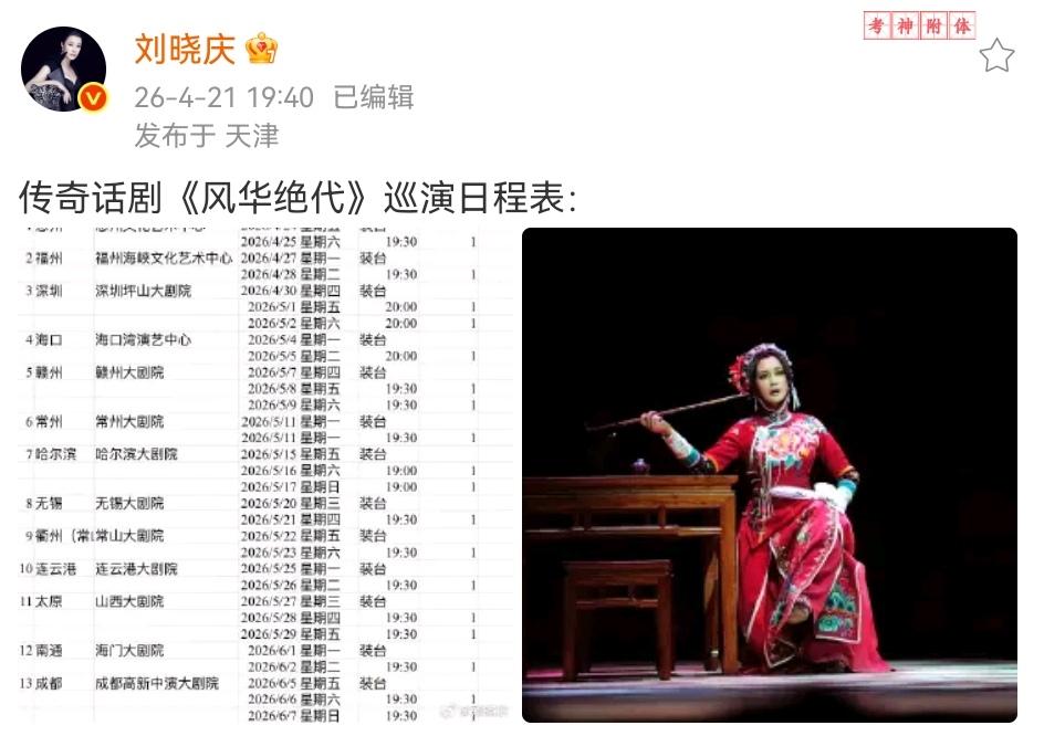 今天,刘晓庆在个人账号晒出了传奇话剧《风华绝代》巡演日程表以及穿着红衣的造型,这造型美得差点认不出,太好看了,惊艳全场是分分钟的事,而且还很减龄,看不出是70多岁的女人,也就50岁的样子。