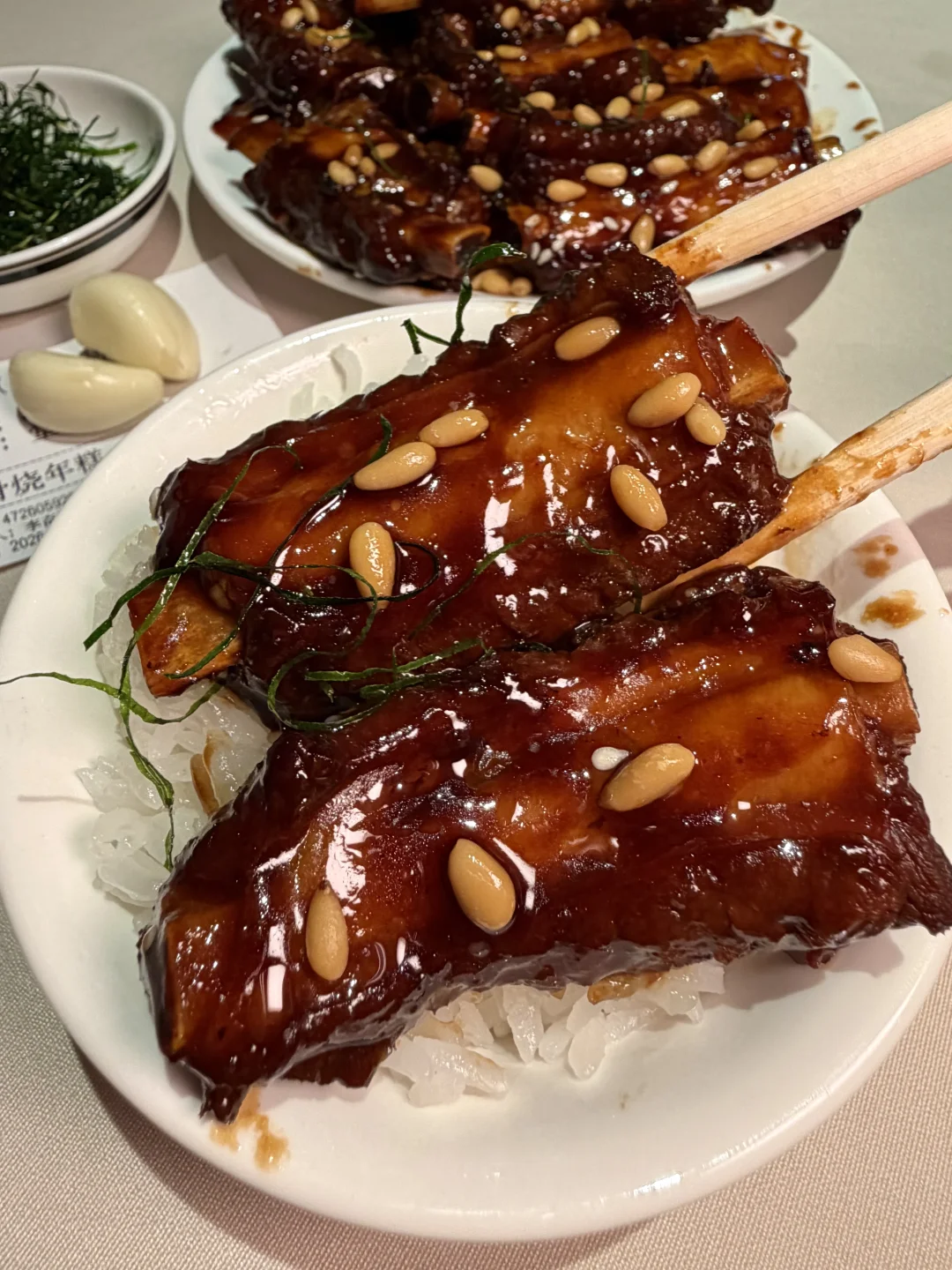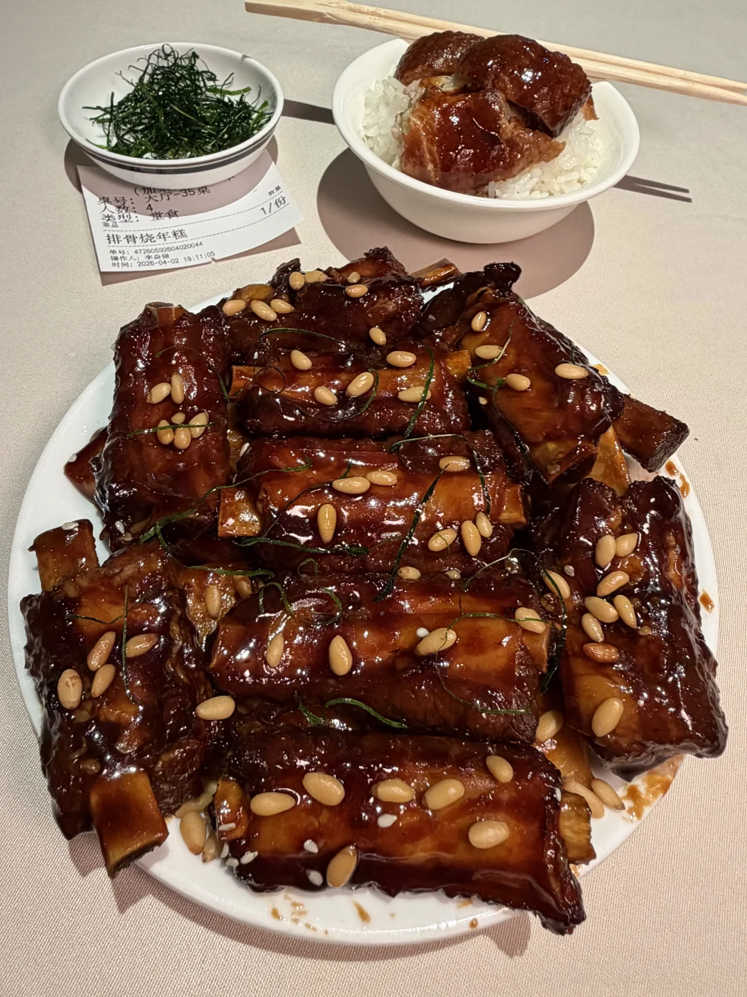 排骨年糕浓油赤酱,单独找店员要了松子一起吃,真的又香又润!
