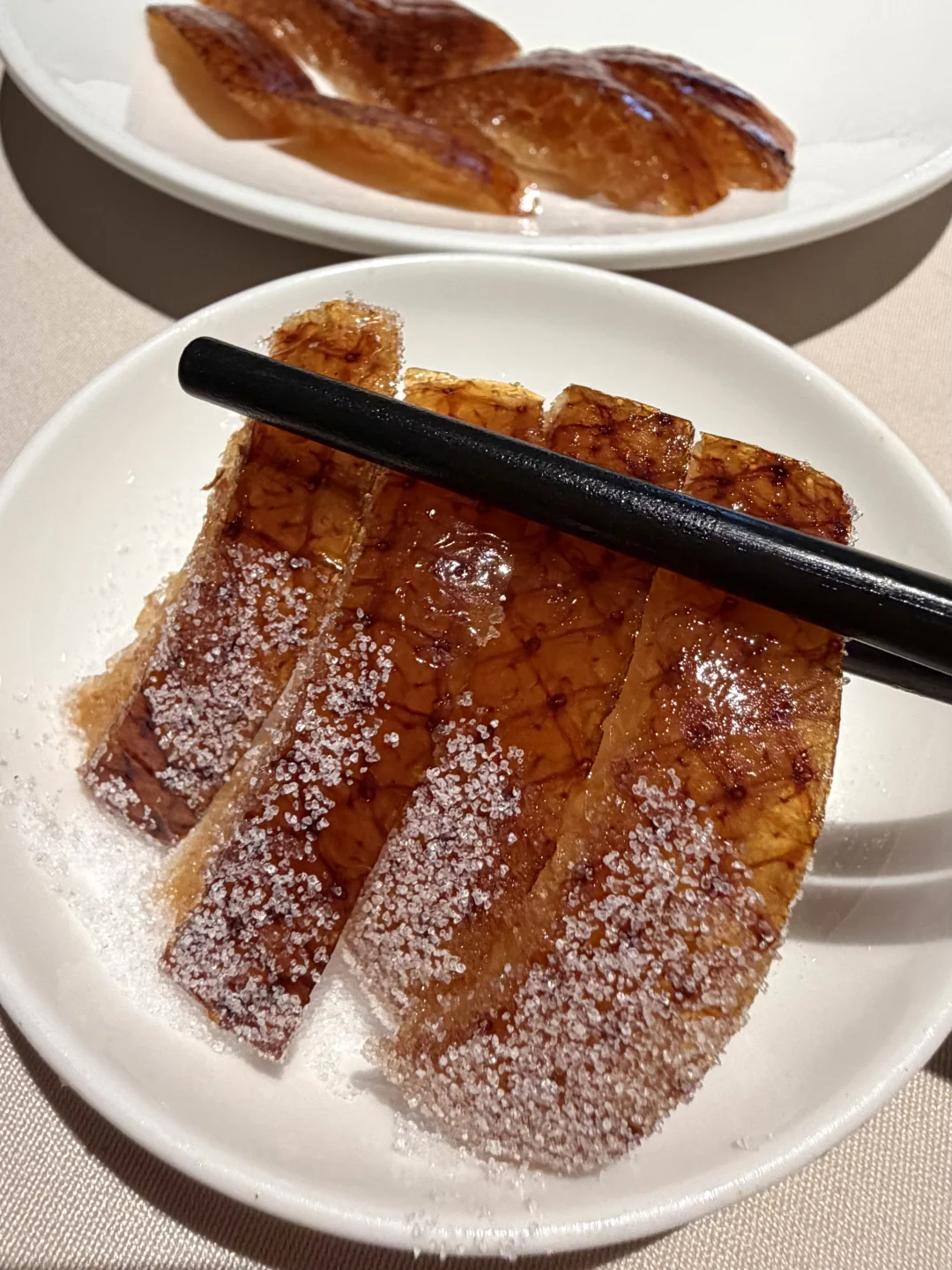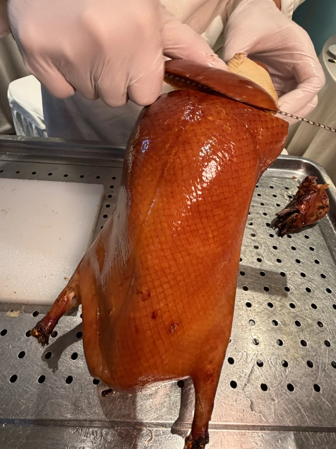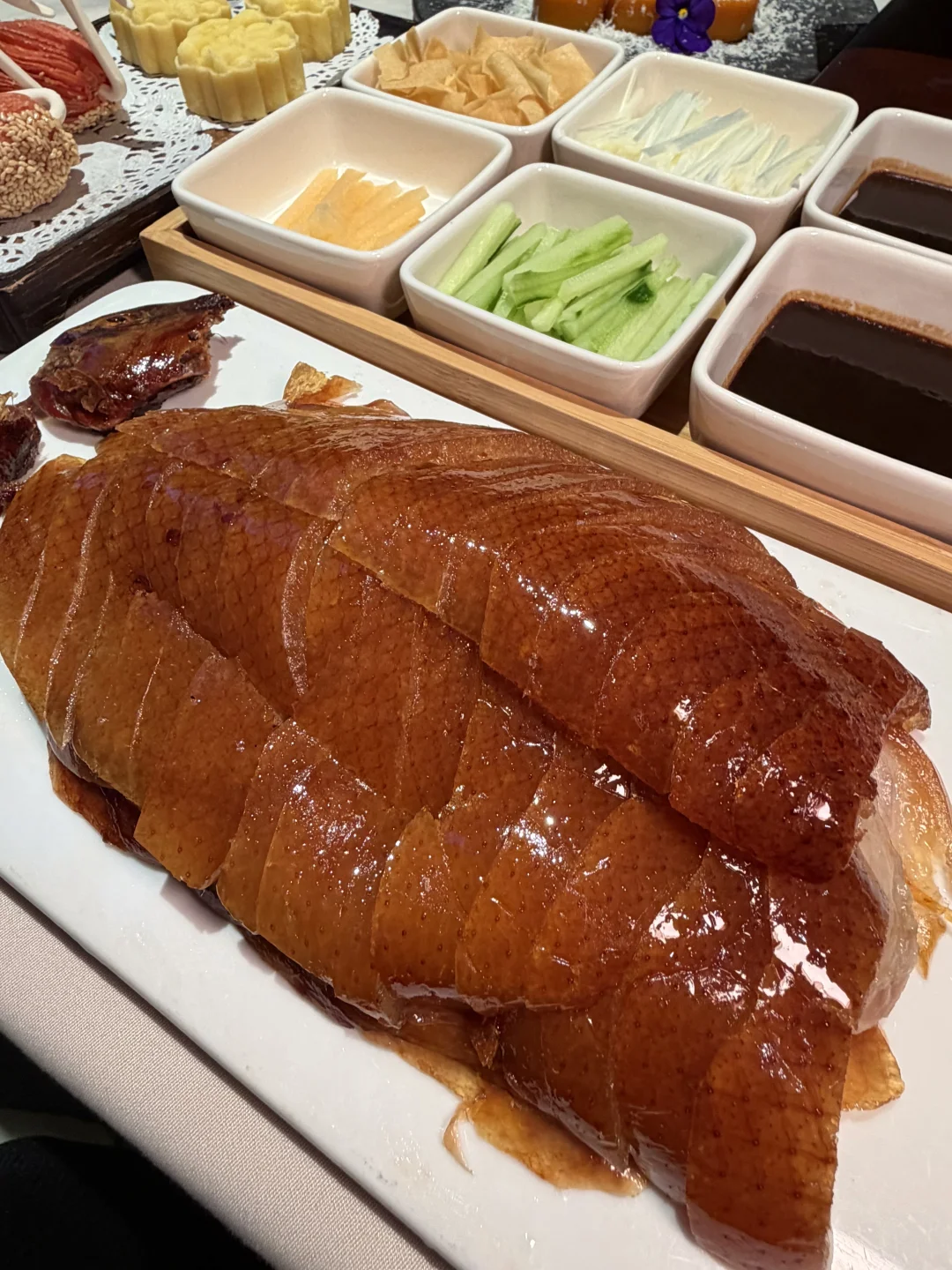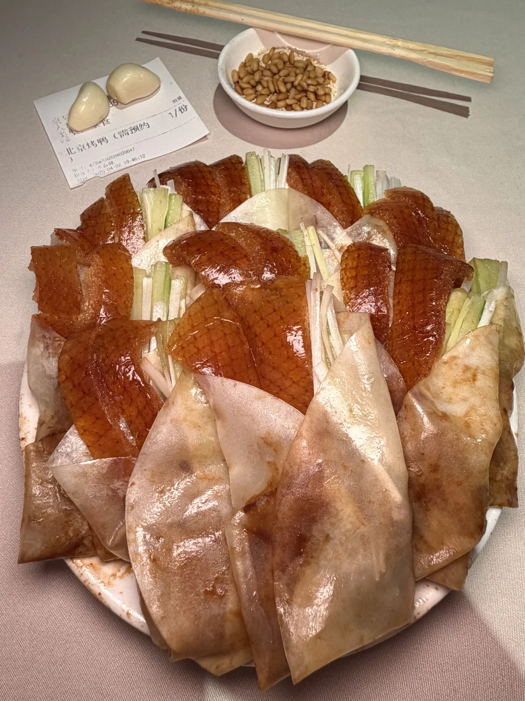 果木烤鸭,现点现片!烤鸭外皮烤的脆脆的,用饼配蘸料包起来吃,香!烤鸭皮蘸白糖很解腻!