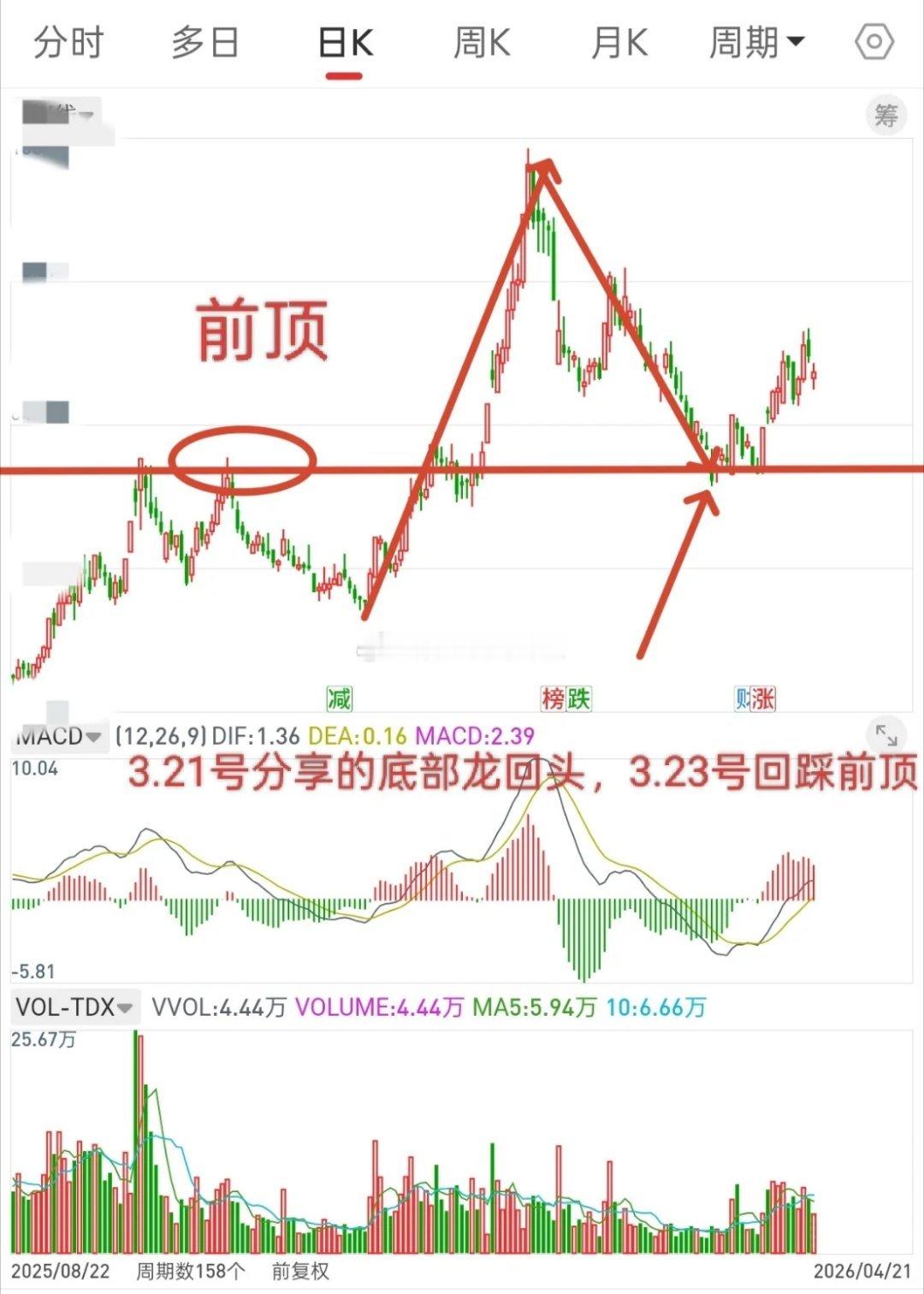 这是指数,而一旦指数回踩到位,那个股,特别是底部龙回头个股,基本全部都会回踩到位,3.23号那天,很多底部龙回头见底(回踩前顶),4.3号那天也有很多底部龙回头见底(回踩前顶)。