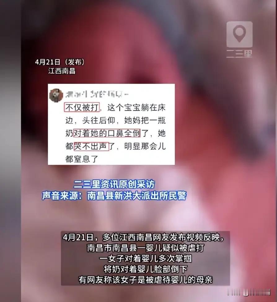 更让人崩溃的是,施暴的不是别人,竟是孩子的亲生母亲。事情发生在南昌县东新街道的一个小区里,大概是4月上旬发生的,直到4月20日视频曝光后,才有爱心人士赶紧报警。