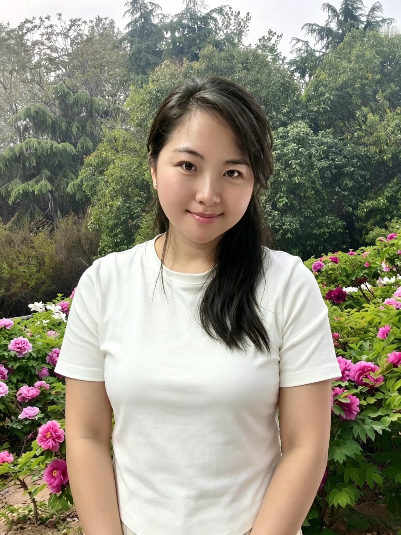 牡丹丛中立娉婷,翠影繁花映玉容。 浅笑嫣然含雅致,清风一缕送香浓。