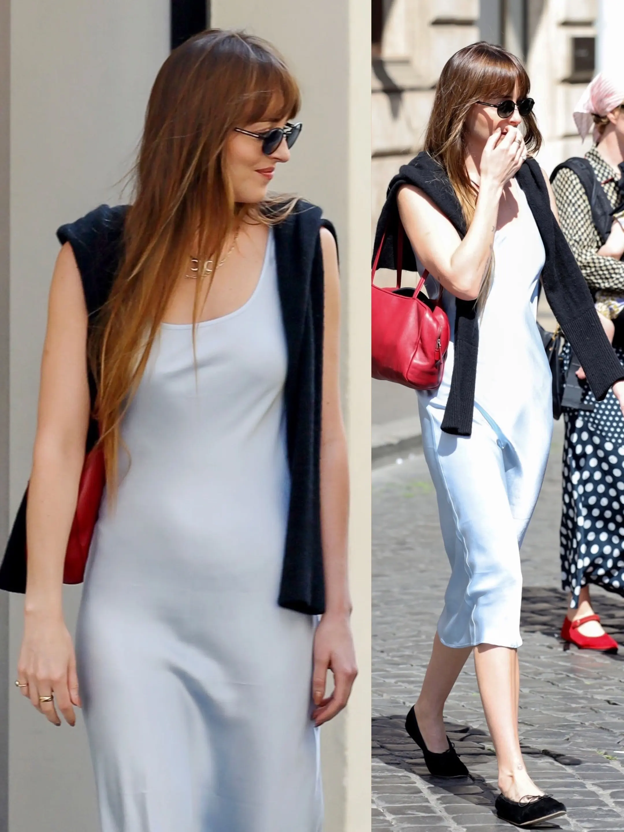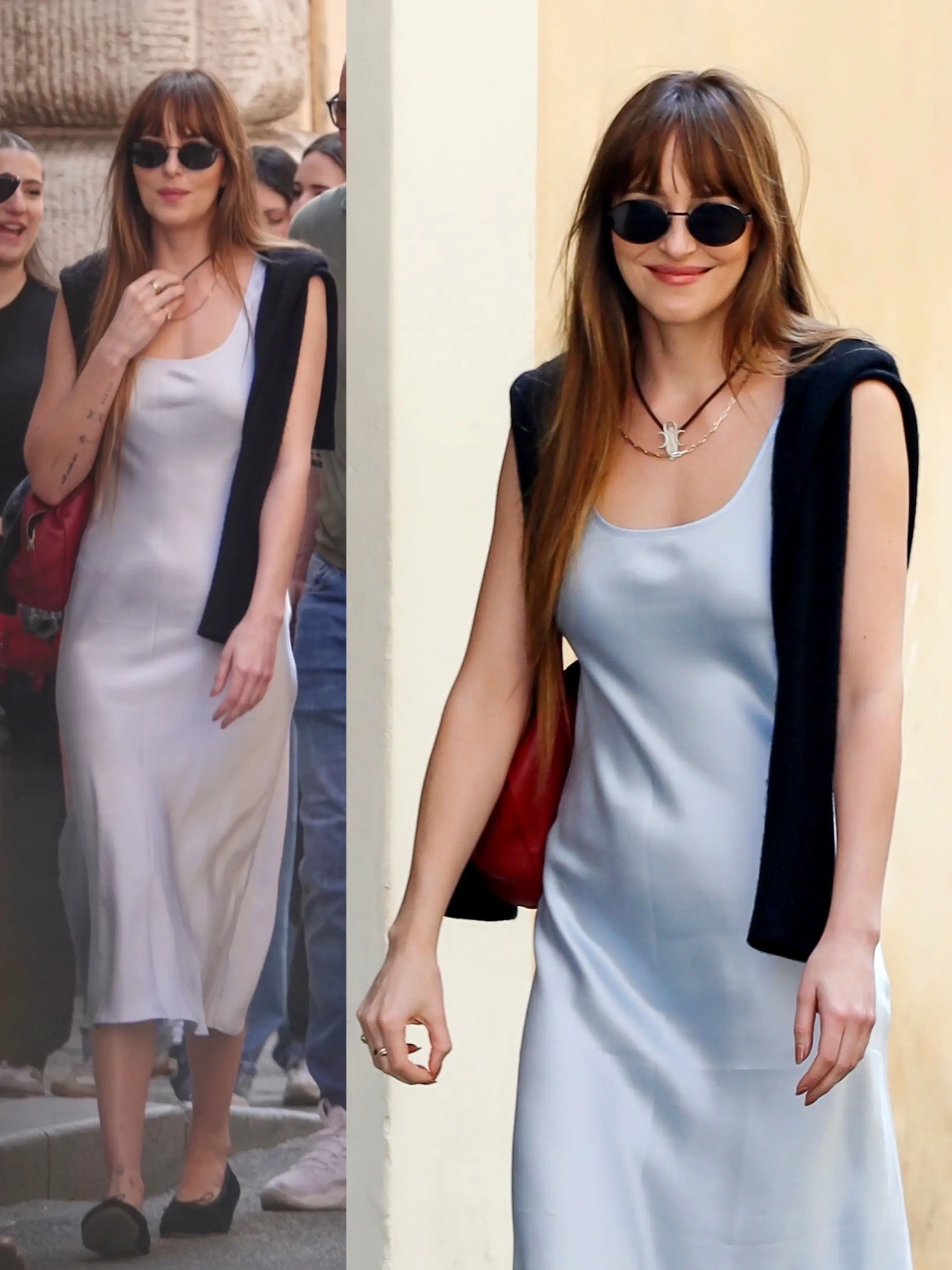 冰蓝与红,夏日清凉穿搭的正确打开方式。Dakota Johnson今日现身罗马,一件冰蓝色长裙搭配红色保龄球手袋与芭蕾鞋,整体氛围没得说,造型借鉴意义也强,这组友人镜头分享的穿搭,终于有了正式“版本”~