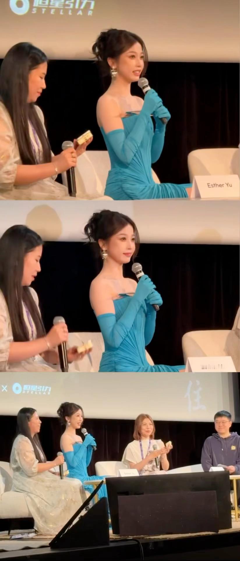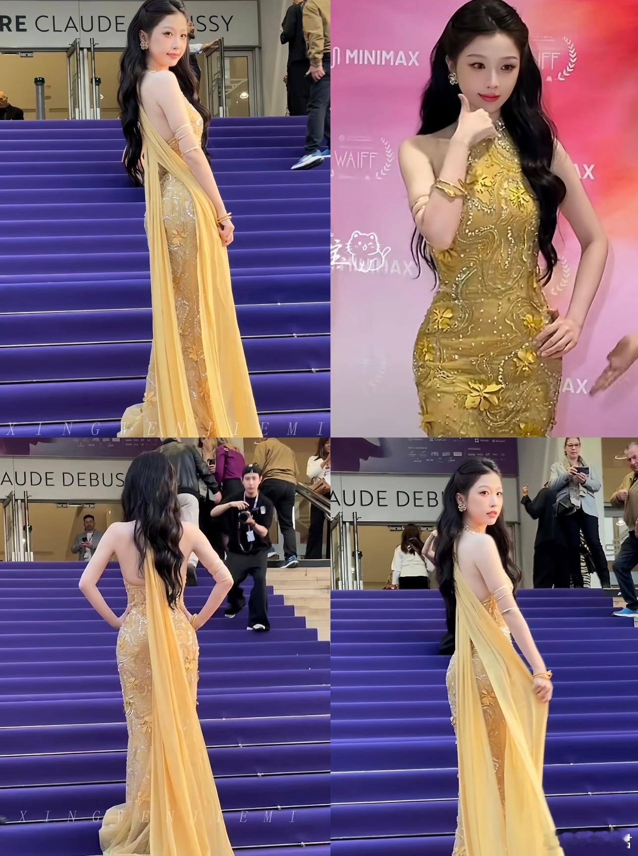 虞书欣戛纳蓝色妖姬造型与金色礼服造型,两套衣服都好美啊,生图状态满分!肤白貌美真
