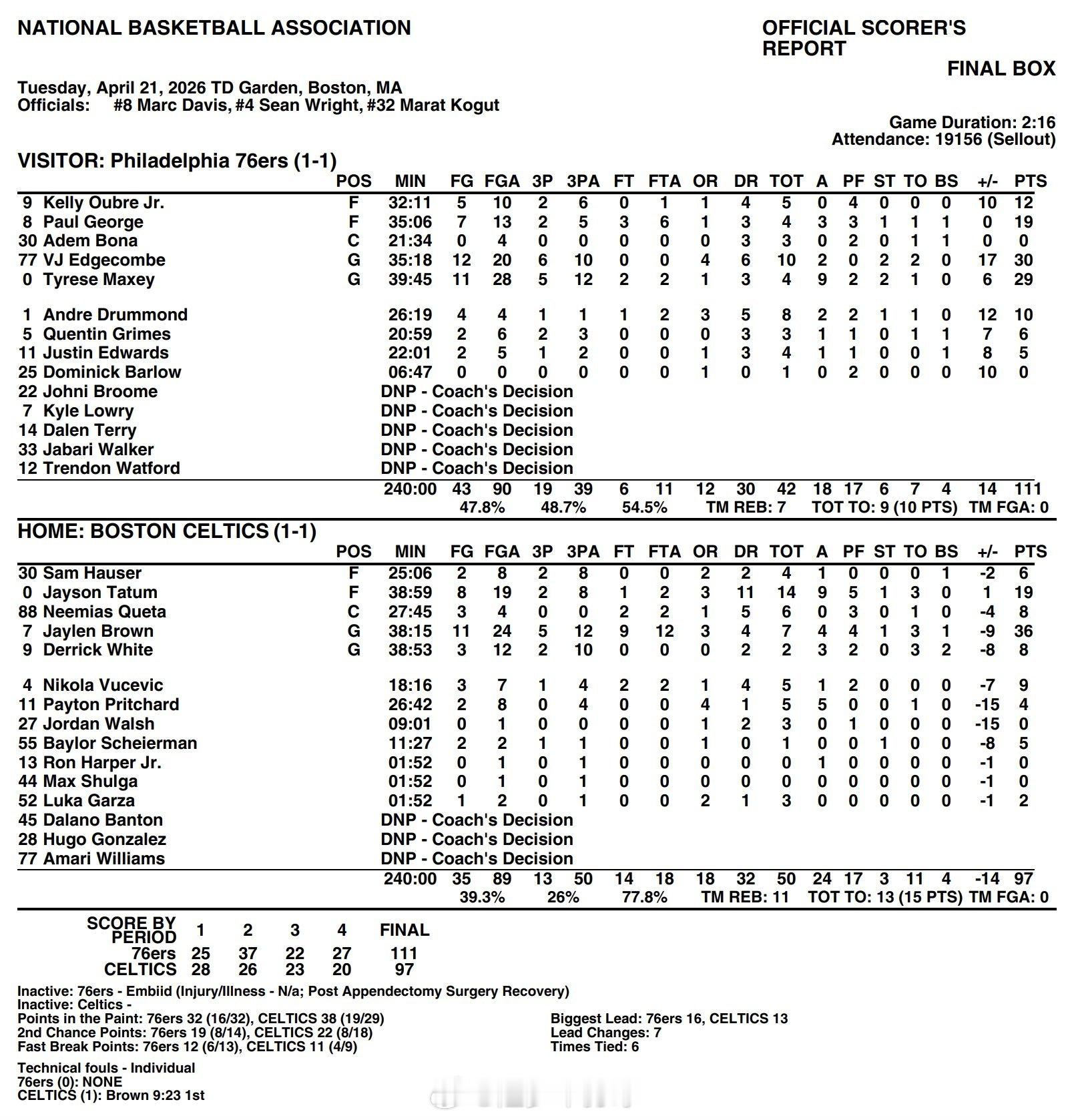 杰伦-布朗36分7篮板4助攻杰森-塔图姆19分14篮板9助攻尼古拉-武切维奇9分5篮板尼米亚斯-克塔8分6篮板德里克-怀特8分3助攻2盖帽佩顿-普里查德4分5篮板5助攻萨姆-豪瑟6分4篮板贝勒-沙伊尔曼5分